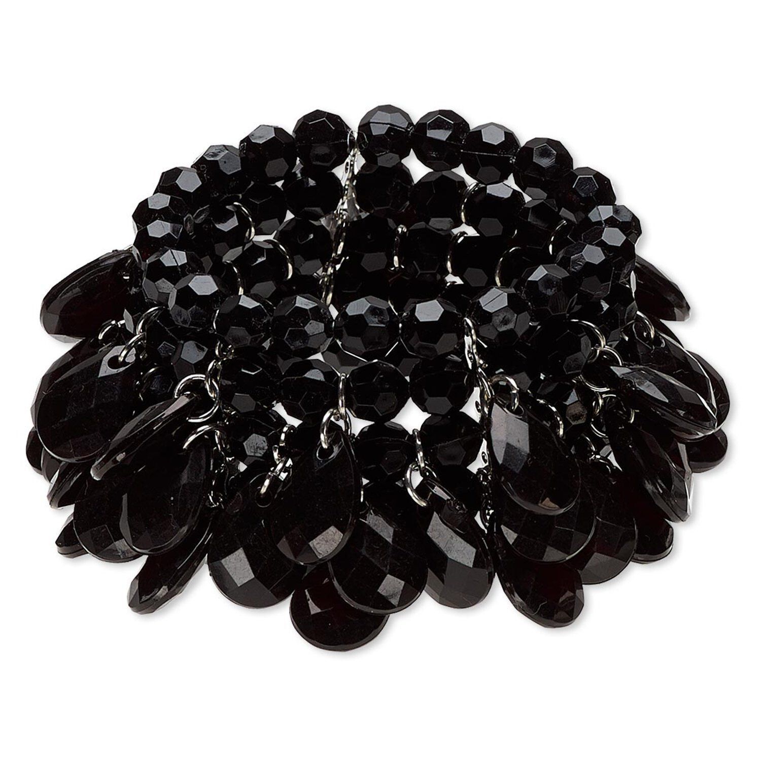 Bracelet, stretch, acrylic and silver-plated steel, black, 38mm wide with round and teardrop, 6-1/2 inches. Sold individually.