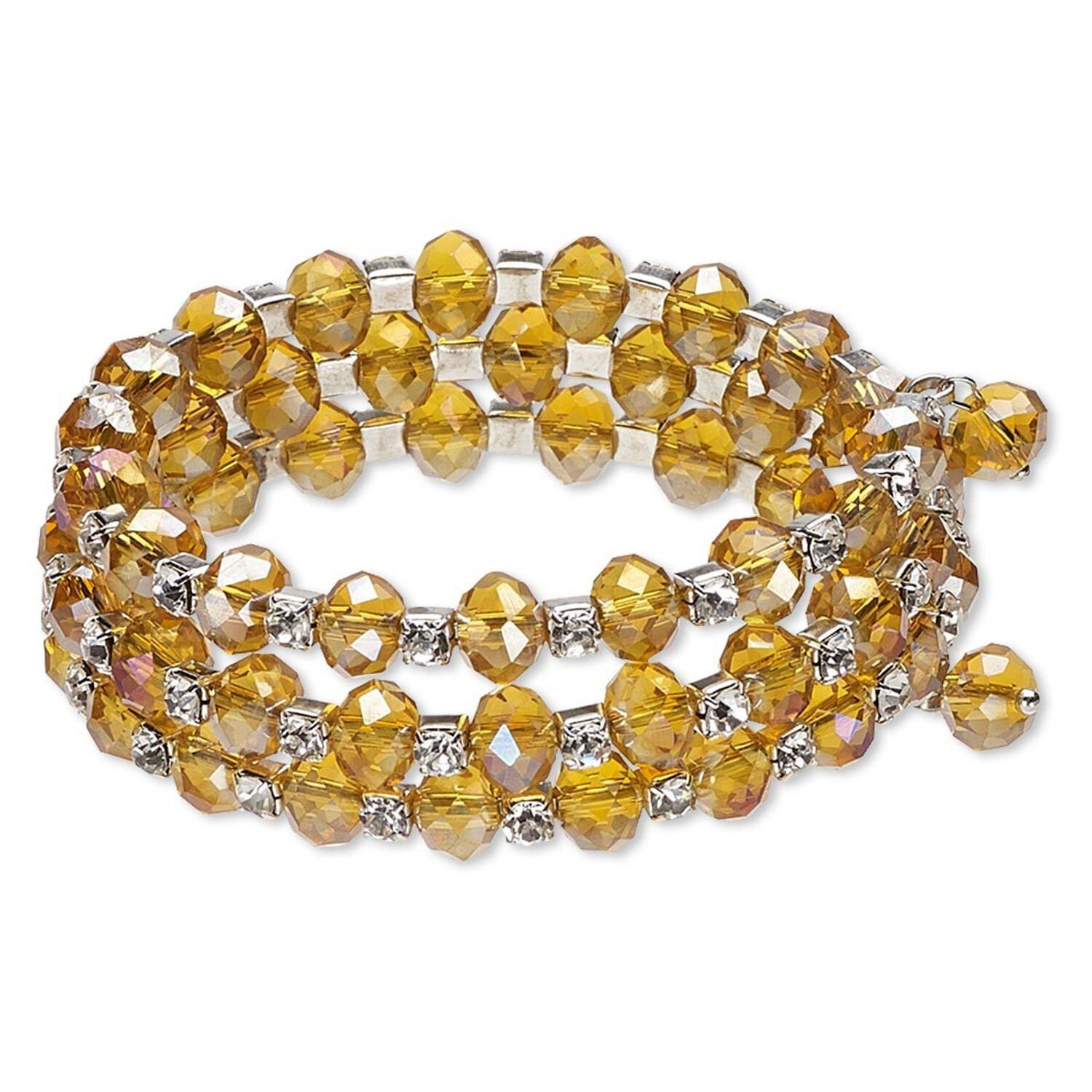 Memory wire bracelet features honey AB faceted rondelles and square beads with clear rhinestones.