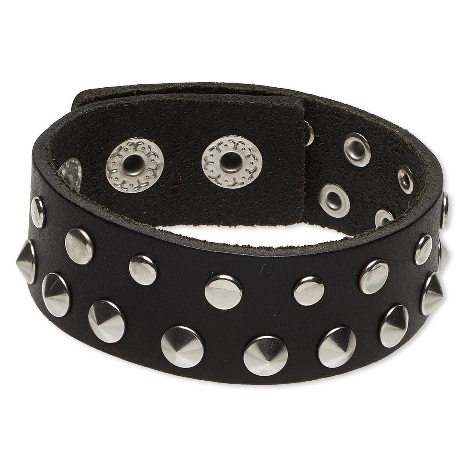 Bracelet, leather (dyed) with imitation rhodium-plated steel and "pewter" (zinc-based alloy), black, 22mm wide with round studs, adjustable from 5-1/2 to 6-1/2 inches with snap closure. Sold individually.
