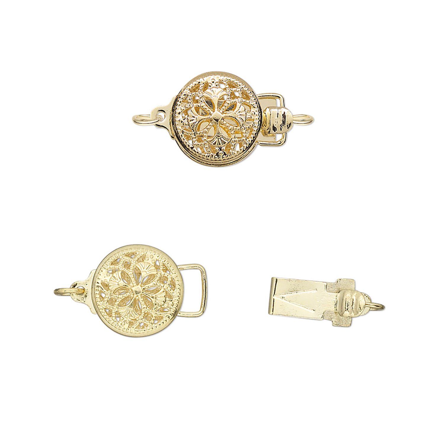 Elegant styles in classic gold-plated round tab clasp. Consistent, quality plating with intricate detail. Lightweight, they're a design staple.