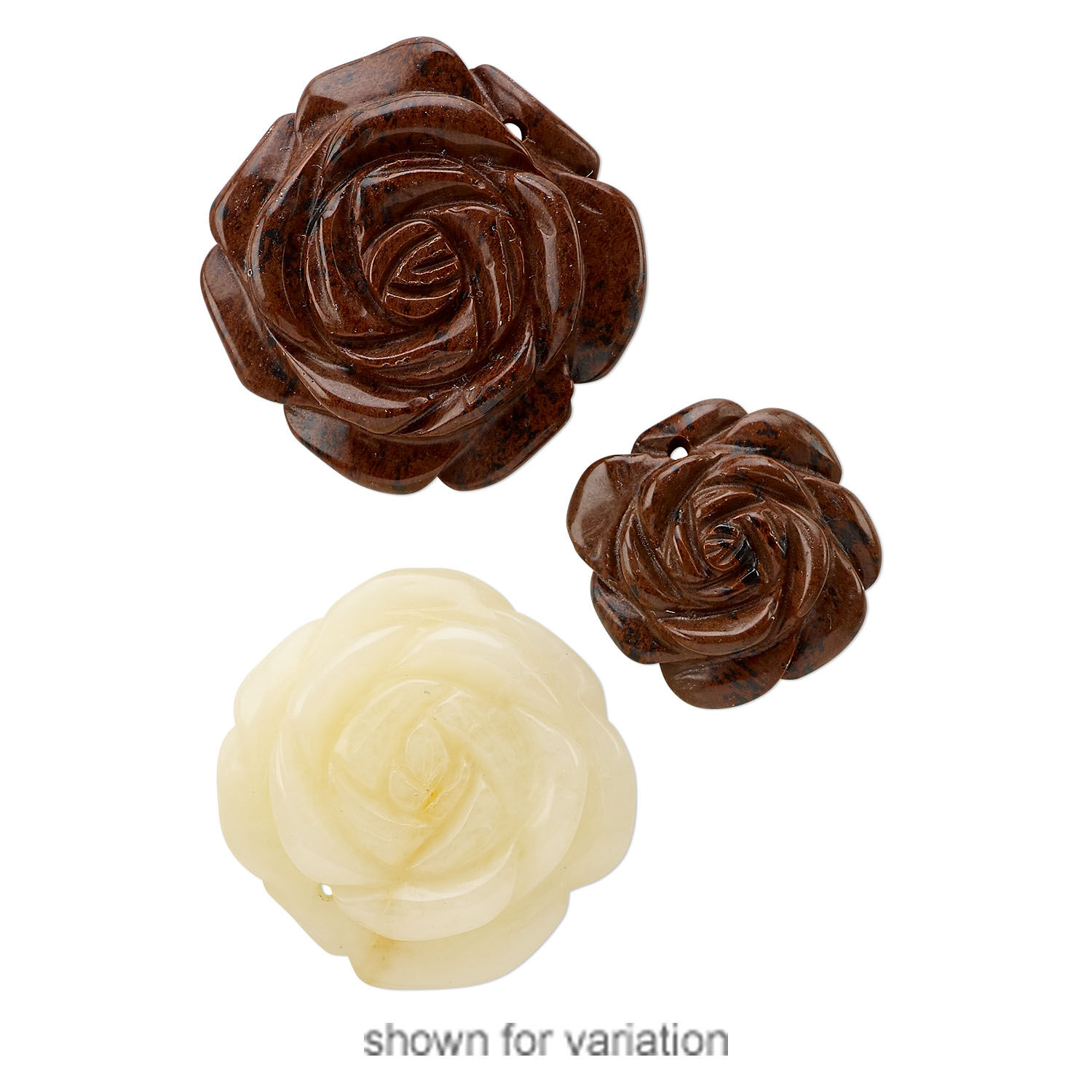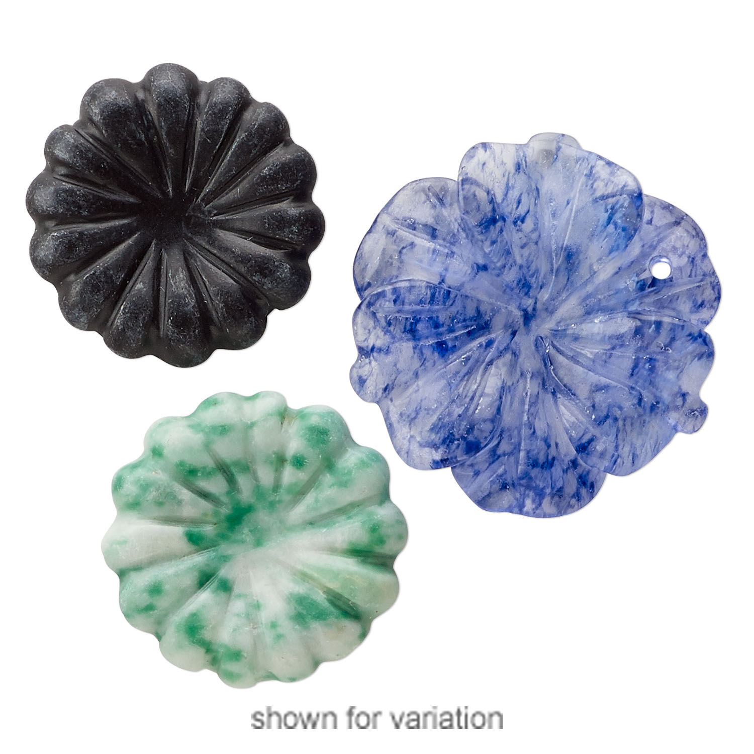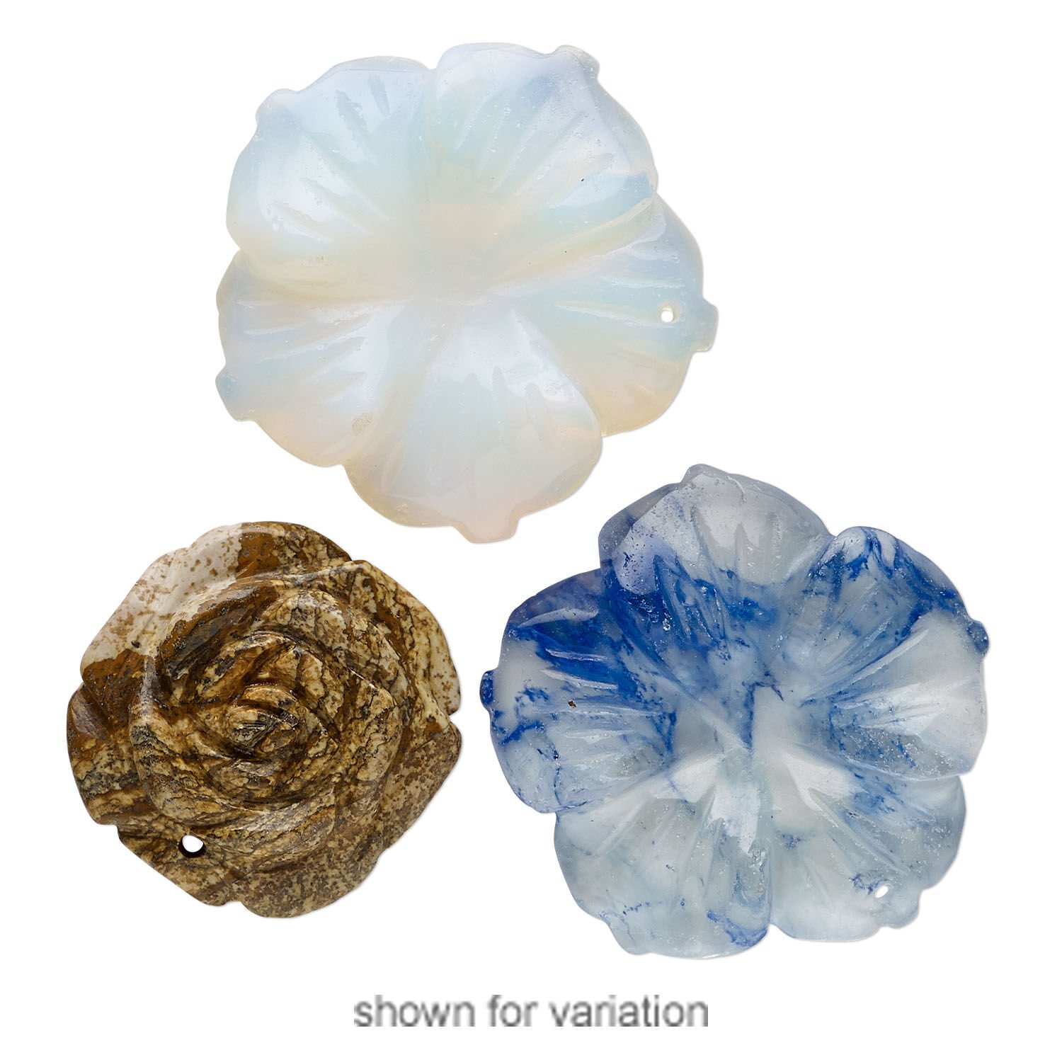Beautifully carved gemstone and glass focal components in varying sizes for flower fresh designs. Materials can include fluorite, snow quartz, sesame jasper and more. Focal components are either top-drilled or contain a tin-alloy pewter loop. Please note that some focals with loops may have a bit of excess glue on the back that has yellowed.