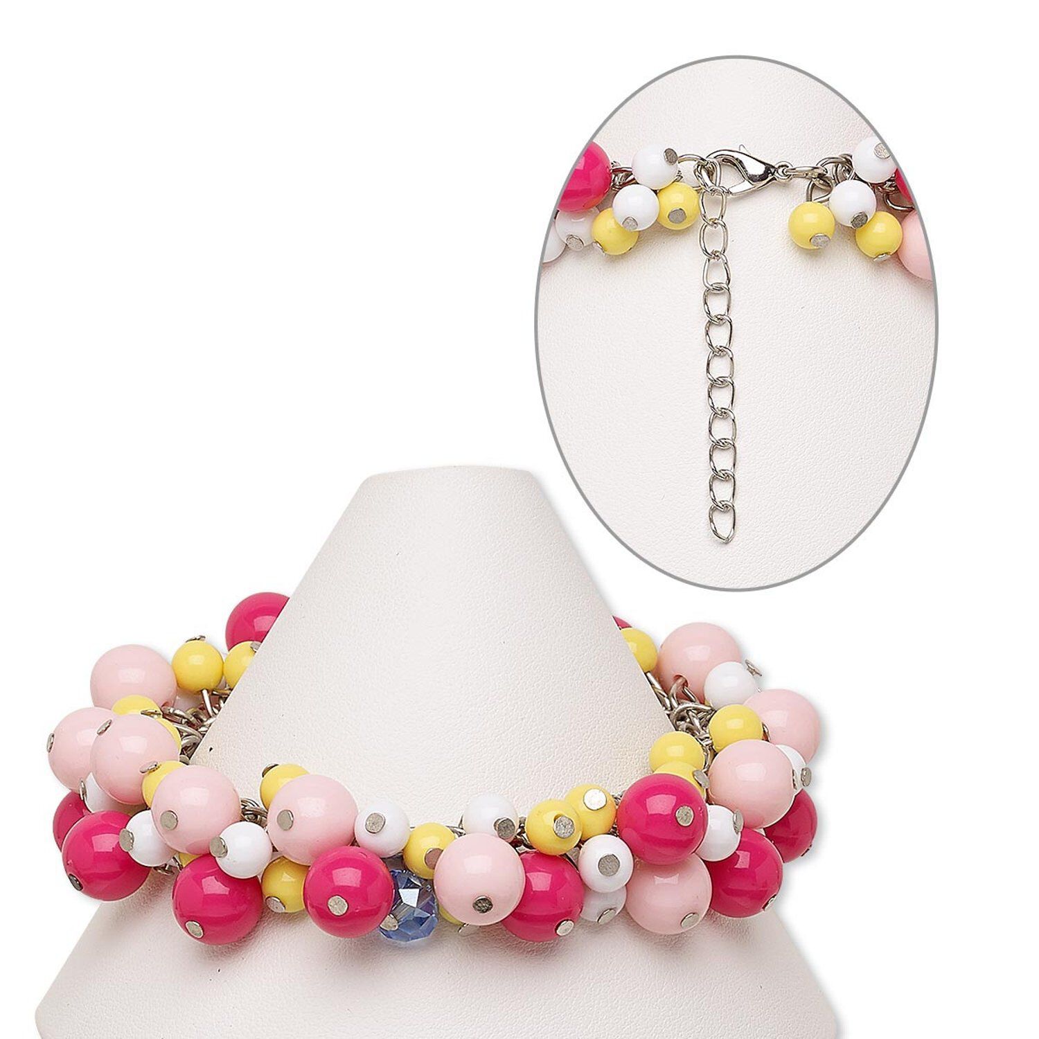 Bracelet, acrylic / glass / silver-finished steel / brass, yellow / pink / multicolored, 23mm wide with round beads, 7 inches with 2-inch extender chain and lobster claw clasp. Sold individually.