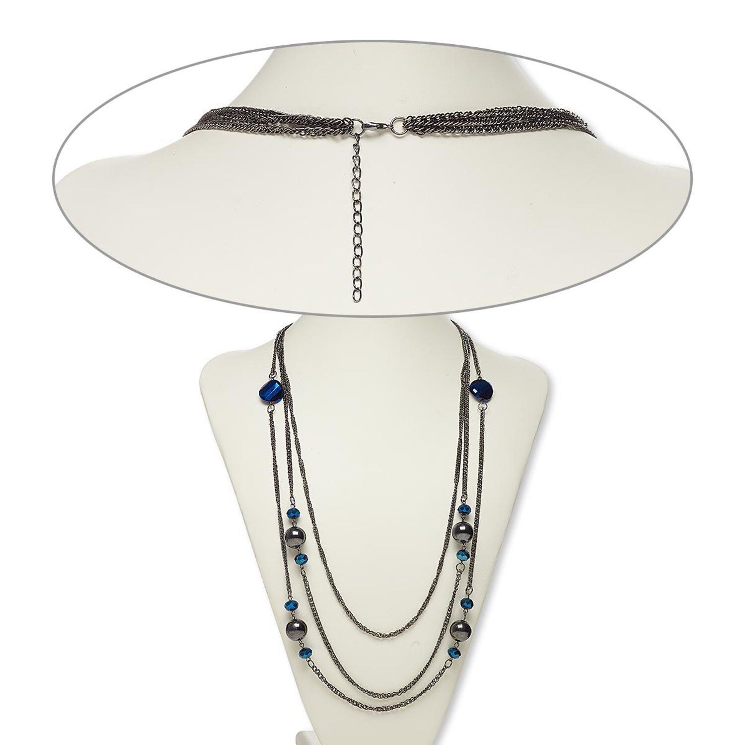 Necklace, glass / gunmetal-coated plastic / gunmetal-finished steel, blue, round, 26 inches with 2-inch extender chain and lobster claw clasp. Sold individually.
