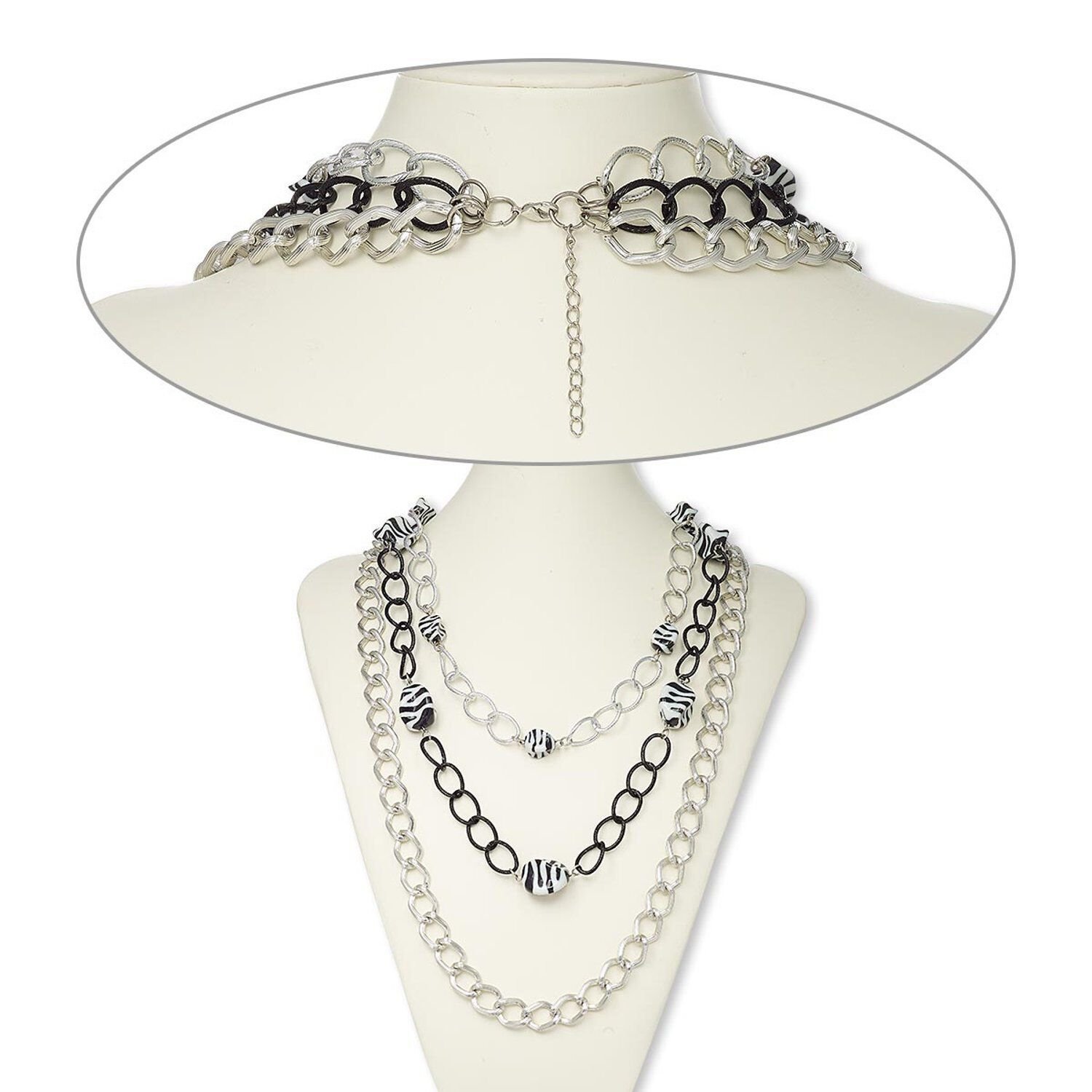 The ready-to-wear necklace features black and imitation rhodium-plated aluminum chains with black and white striped acrylic beads. It is ideal for gift-giving and counter sales or extending current jewelry lines. The overall necklace length measures 26 inches. Colors, shapes and sizes may vary in each lot.