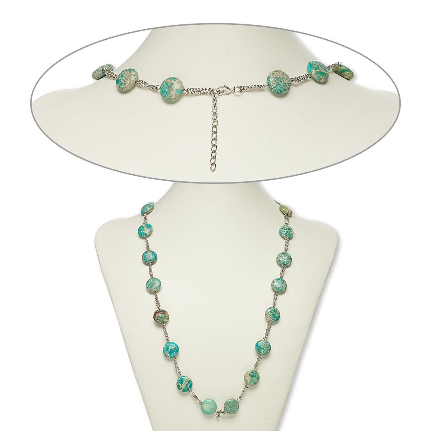 This ready-to-wear necklace featuring flat round magnesite beads is ideal for gift-giving, counter sales or extending current jewelry lines. Colors, shapes and sizes may vary in each lot.