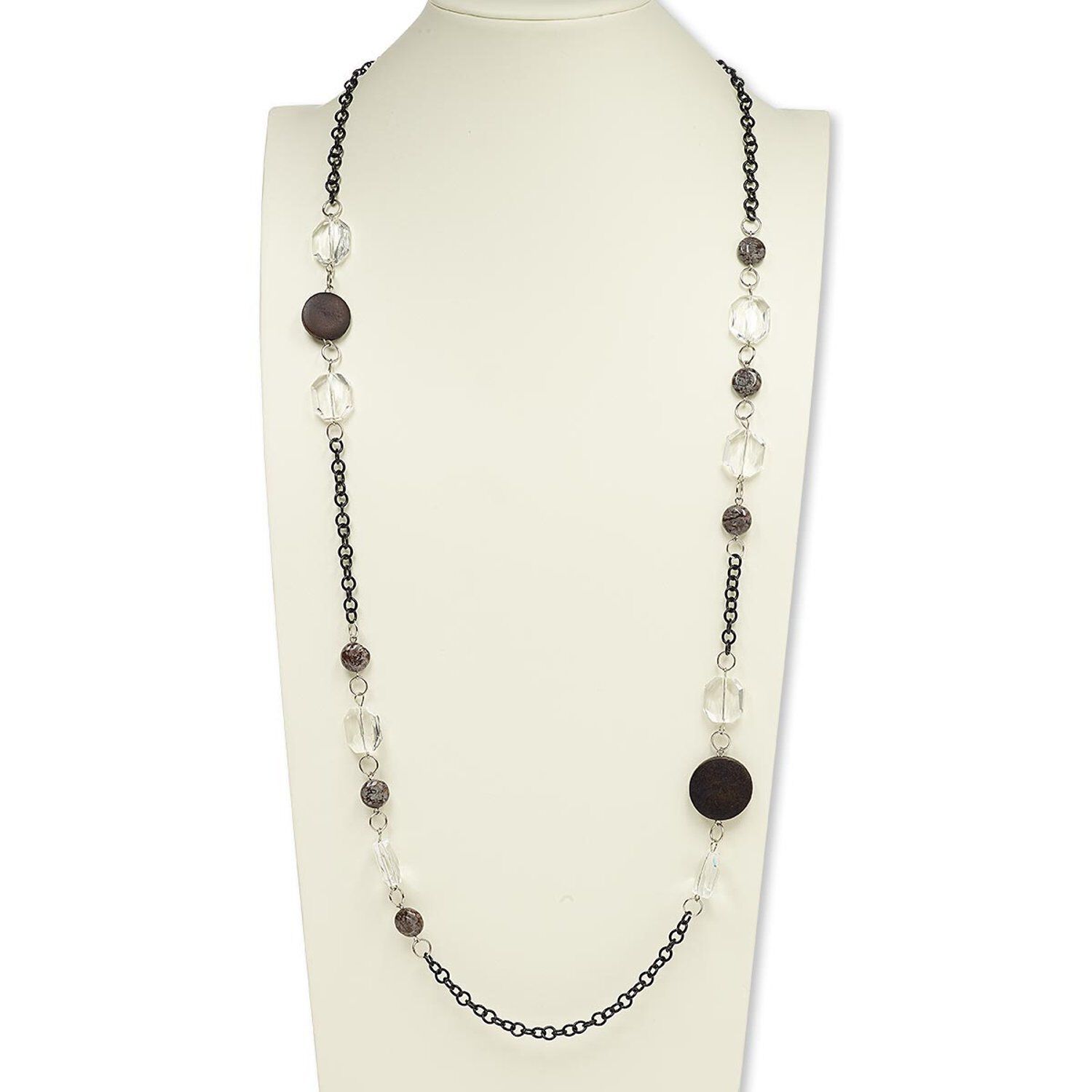 Necklace, wood / brown snowflake jasper (natural) / glass / silver- / black-finished steel, clear and brown, flat round, 32-inch continuous loop. Sold individually.