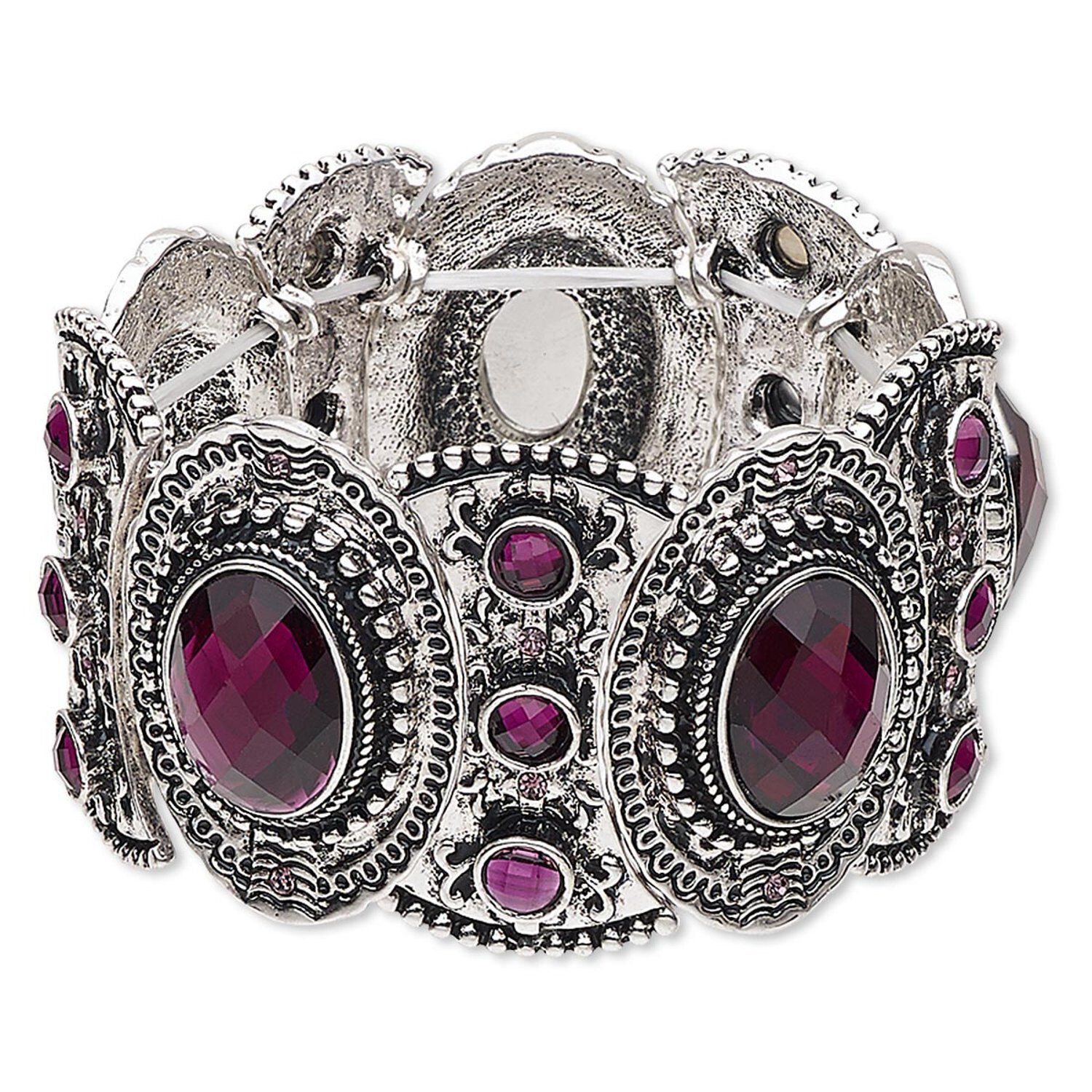 Bracelet, stretch, acrylic and antique silver-finished "pewter" (zinc-based alloy), purple, 38mm wide with oval design, 6 inches. Sold individually.
