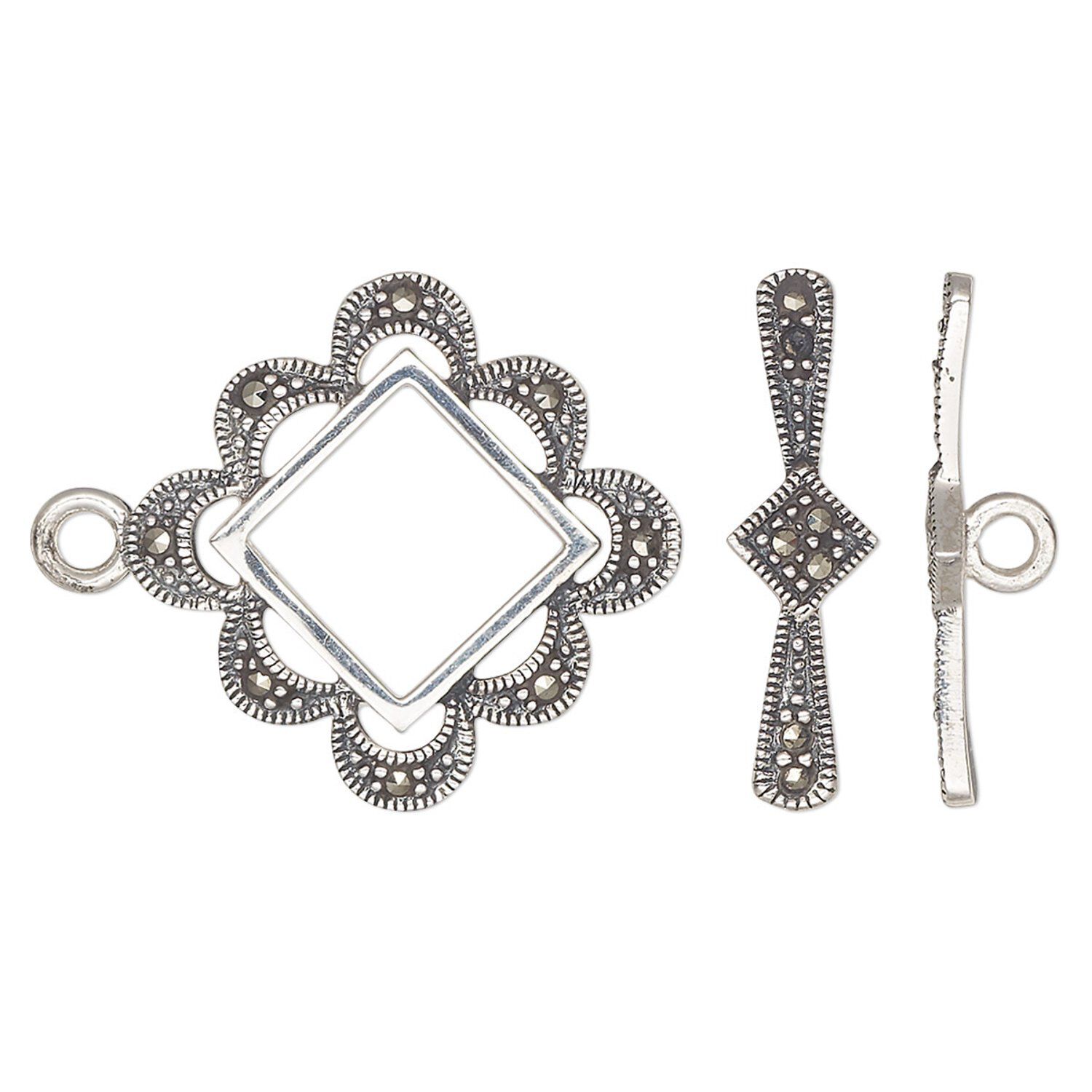 Clasp toggle 1pkg1 sterling silver / marcasite (natural), 24x23mm fancy diamond, 1-strand