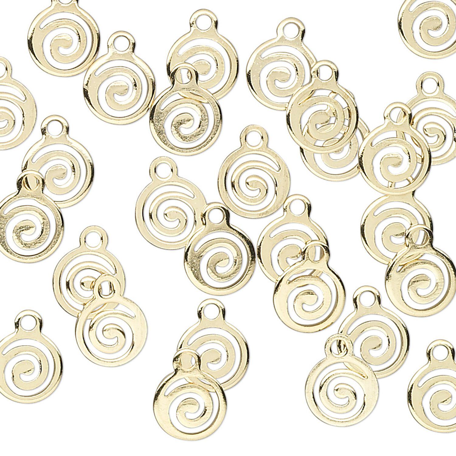 Drop, gold-plated brass, 7mm round with open swirl. Sold per pkg of 100.