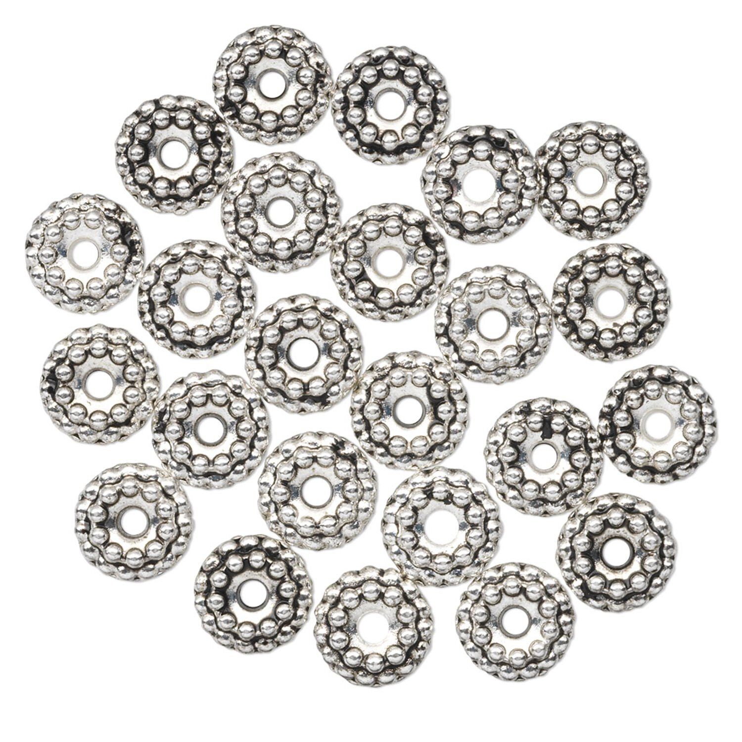 Double-dot style rondelle is available in both antiqued gold and antiqued silver textured finishes. Rondelles can also be used as spacer beads.