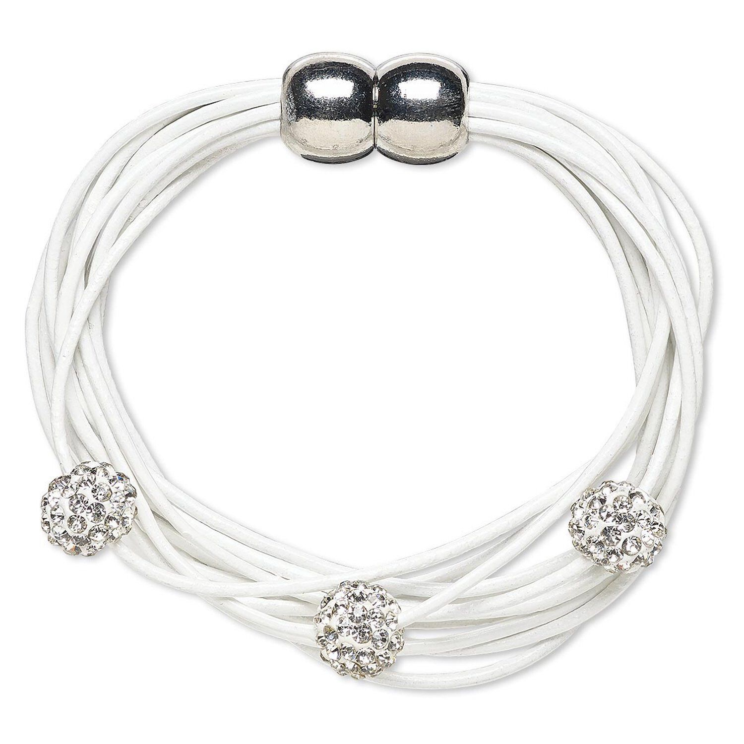 Multiple leather cords merge in a magnetic clasp to create this easy-to-wear bracelet featuring sparkling glass rhinestones. White leather and silver-plated metal components make this bracelet easy to sell, too. Standard magnetic strength. Colors, shapes and sizes may vary in each lot.