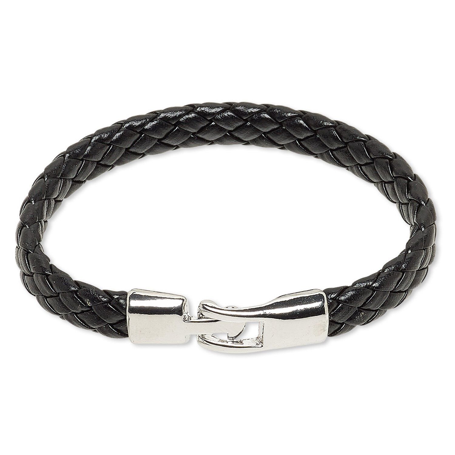 Bracelet, leather (dyed) and imitation rhodium-plated "pewter" (zinc-based alloy), black, 18mm wide woven, 7 inches with buckle-style clasp. Sold individually.