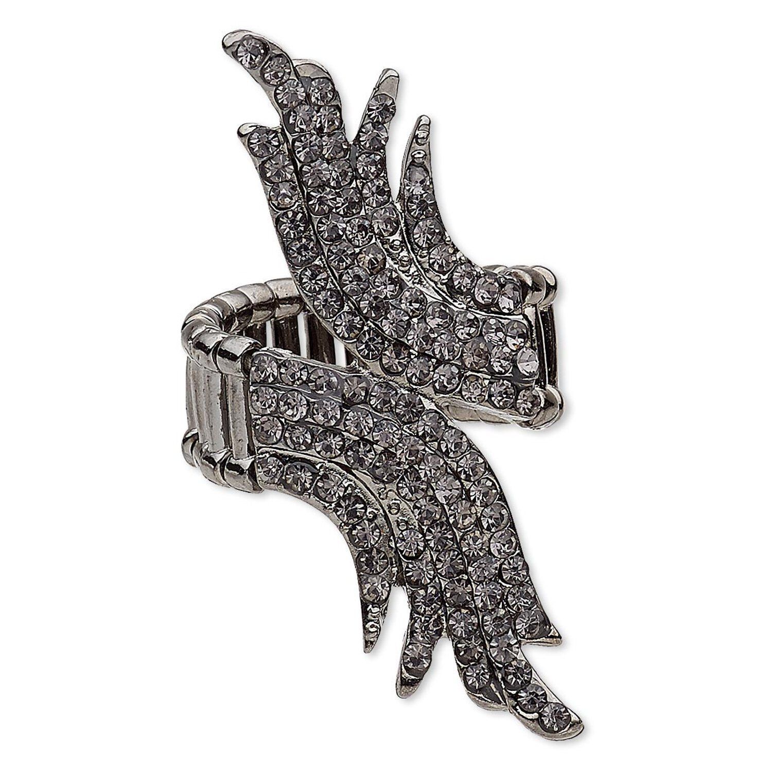 Ring, stretch, glass rhinestone and gunmetal-plated "pewter" (zinc-based alloy), grey, 54x20mm wings. Sold individually.