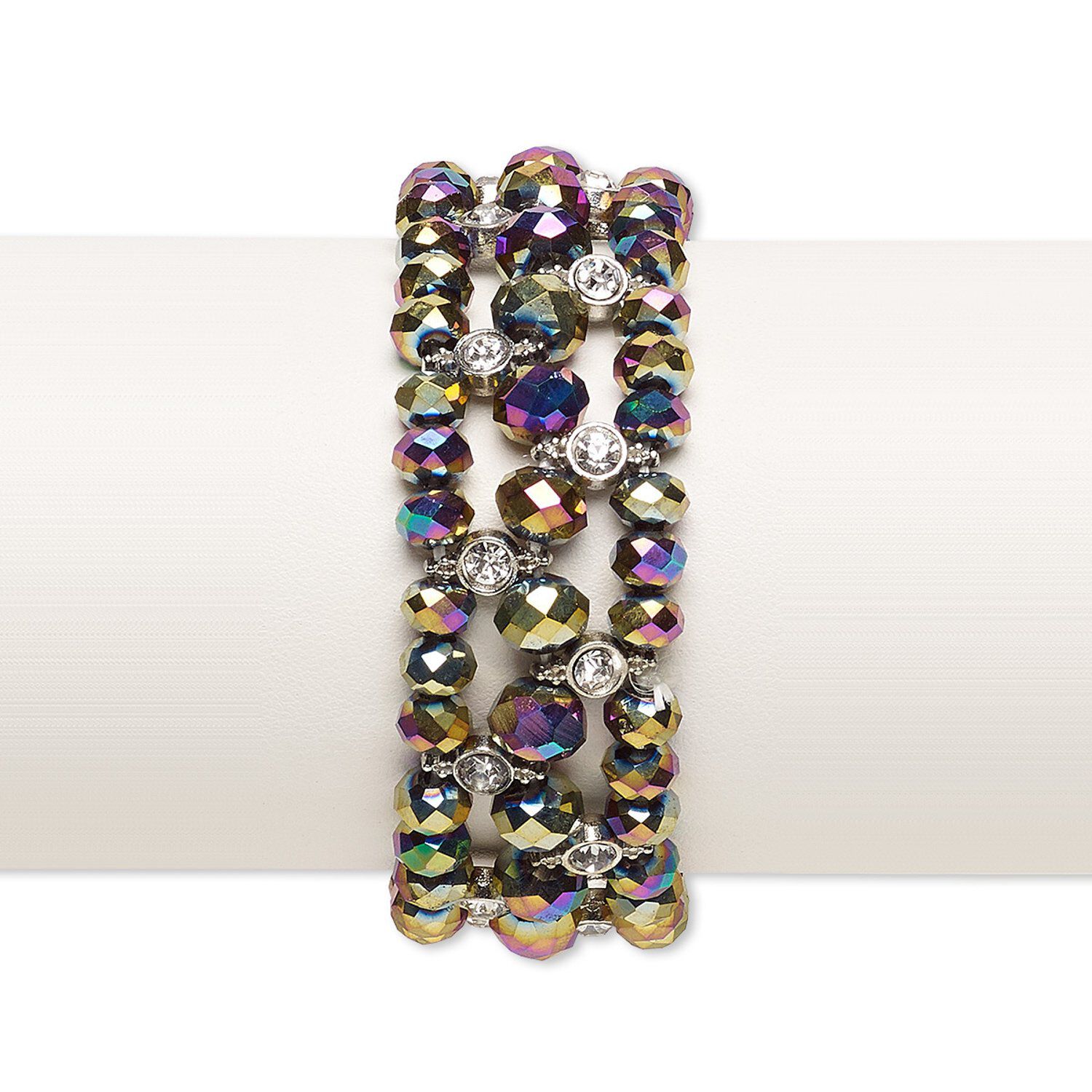 Bracelet, stretch, glass and antique silver-plated "pewter" (zinc-based alloy), clear and metallic rainbow, 26mm wide, 6 inches. Sold individually.