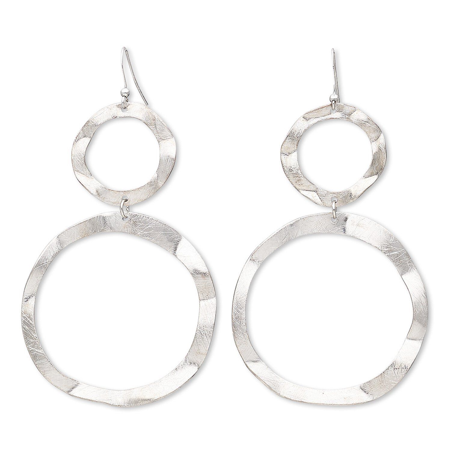 Earring, imitation rhodium-finished brass and steel, 3-1/2 inches with brushed circles and fishhook ear wire. Sold per pair.
