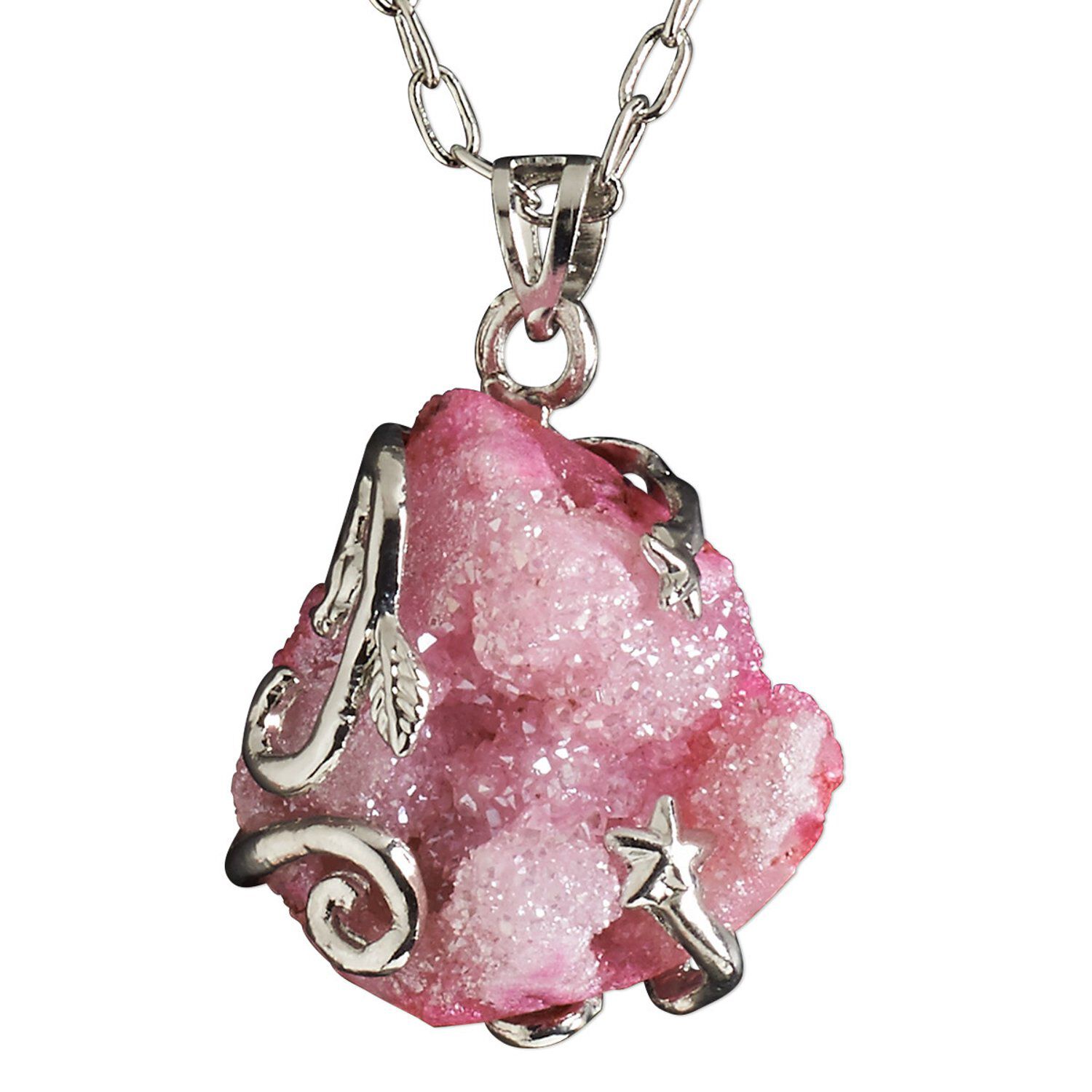 Necklace, electroplated druzy agate (coated) and imitation rhodium-plated brass, pink, 30x20mm-38x28mm hand-cut wire-wrapped freeform, 20 inches with 2-1/2 inch extender chain and lobster claw clasp. Sold individually.