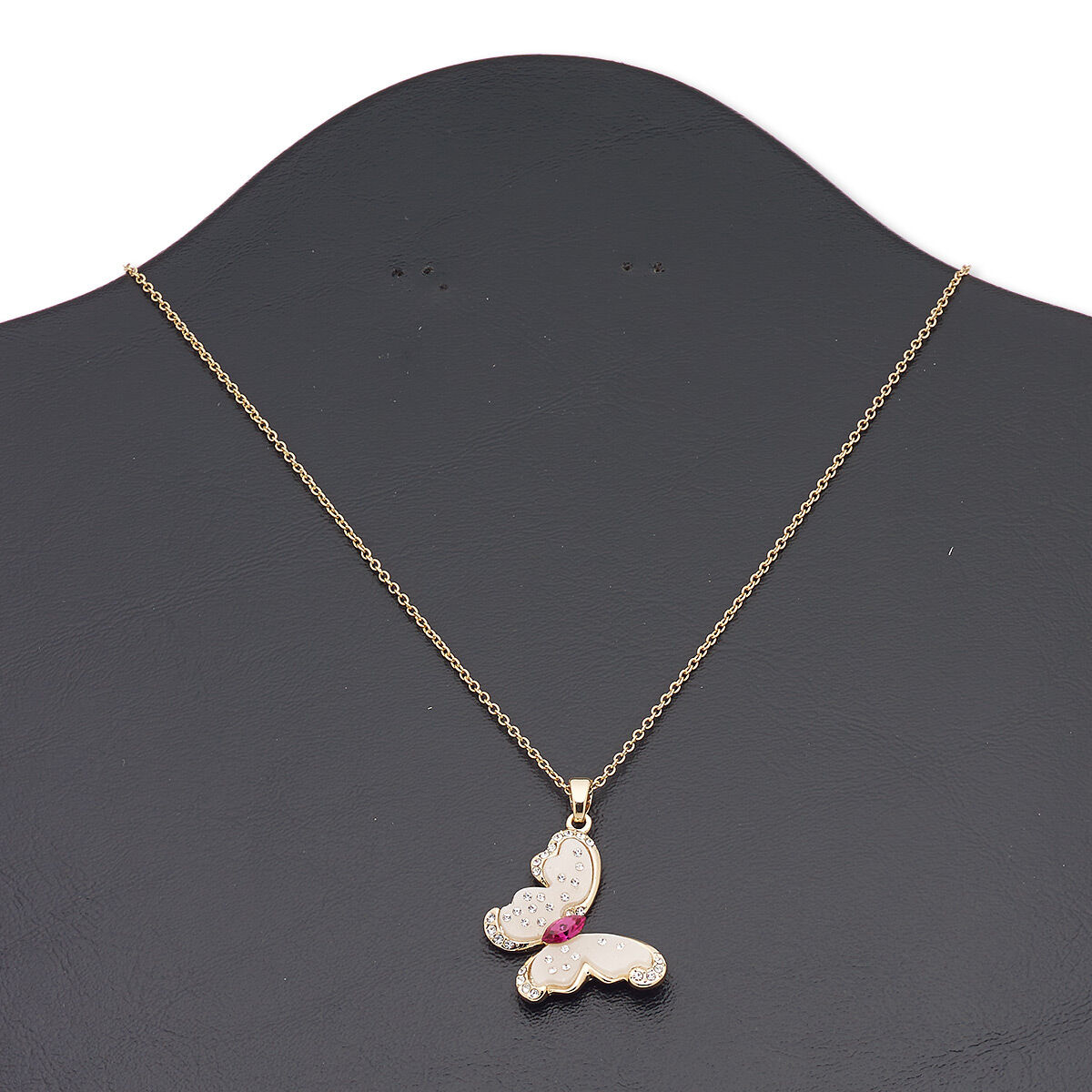 Necklace, Everyday Jewelry, acrylic / crystals / Czech glass rhinestone / gold-finished brass / "pewter" (zinc-based alloy) / steel, champagne / clear / fuchsia, 33x24mm butterfly, 16 inches with 3-inch extender chain and lobster claw clasp. Sold individually.