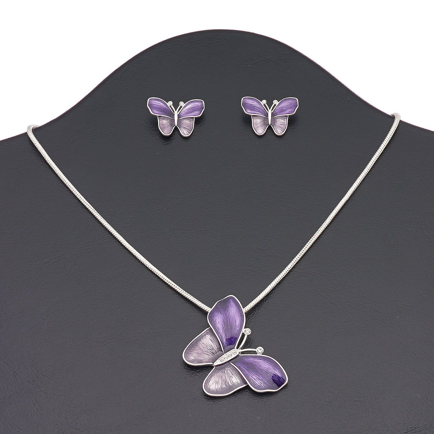 Add a dash of cheerfulness to your style with this silver-finished necklace and earring set. Beautifully saturated purple butterflies and glass rhinestones highlight this delightful set. Ready-to-wear jewelry is great for a gift or counter sales.