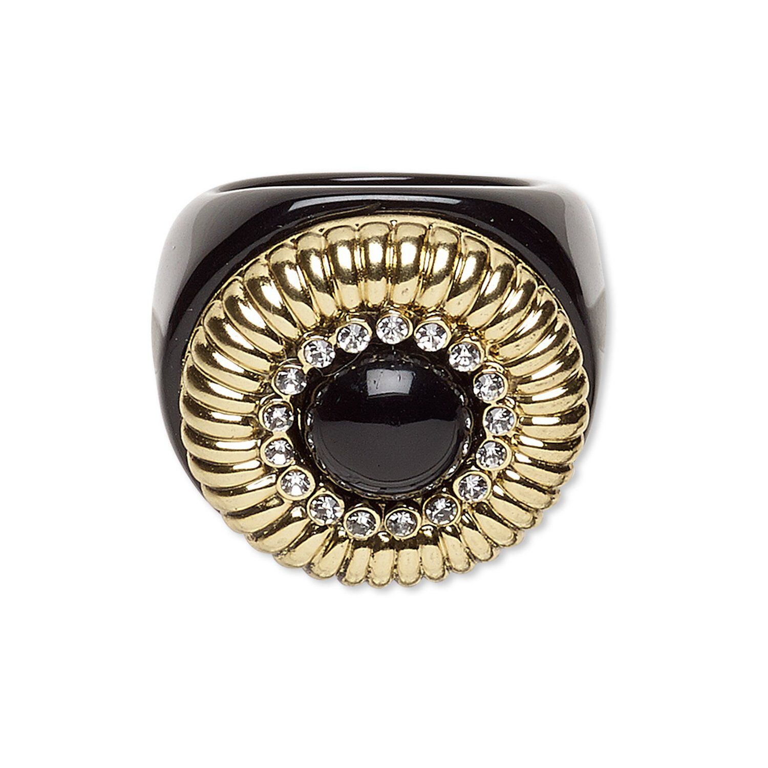 Ring, acrylic and glass rhinestone, black / gold / clear, 23mm round, size 7. Sold individually.