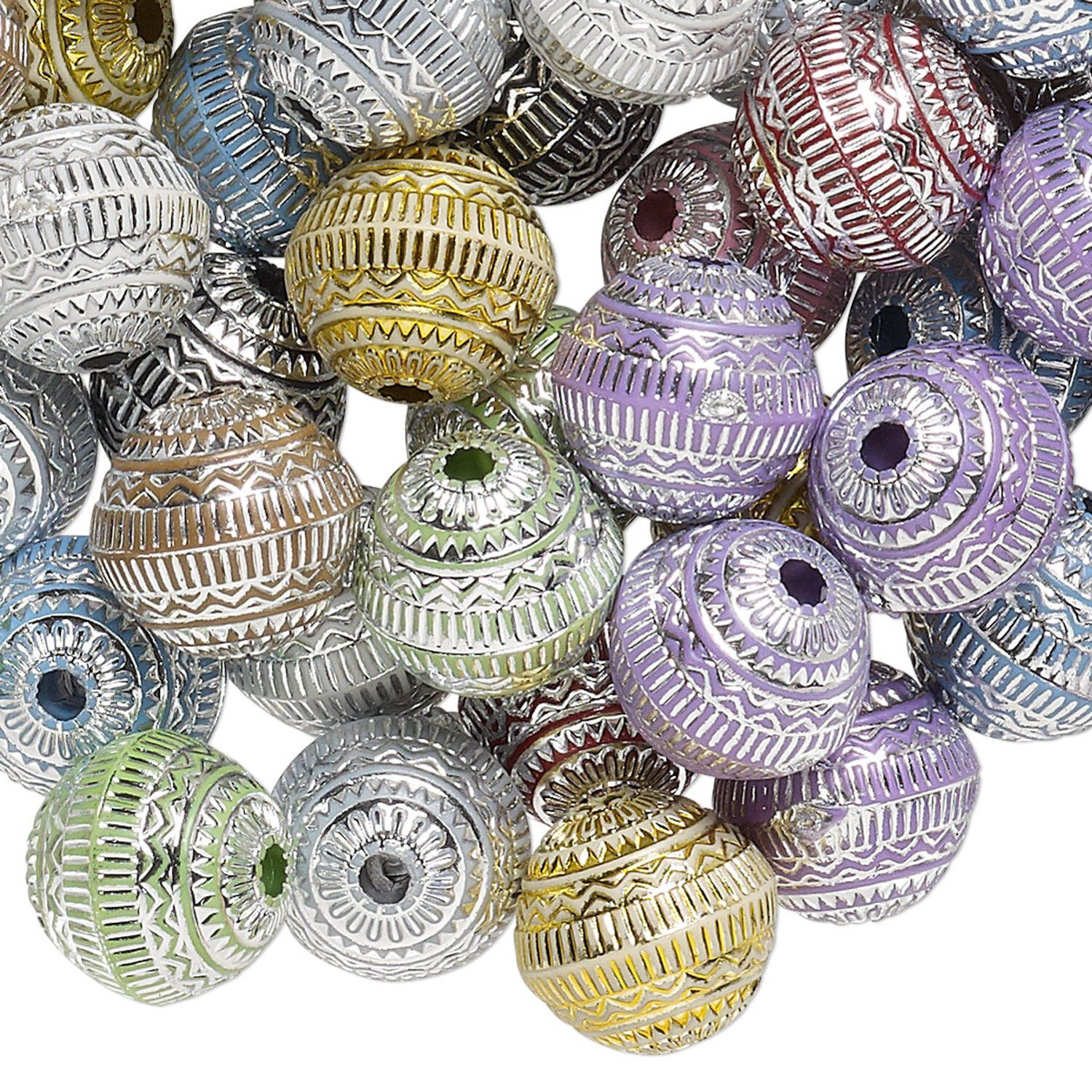 Lightweight acrylic beads are molded for consistent size and shape. Each bead features silver-colored angular cuts that create the illusion of rhinestones. Colors can include white, grey, pink, green, blue, purple, red, brown and black with silver-colored designs and ivory with gold-colored designs.