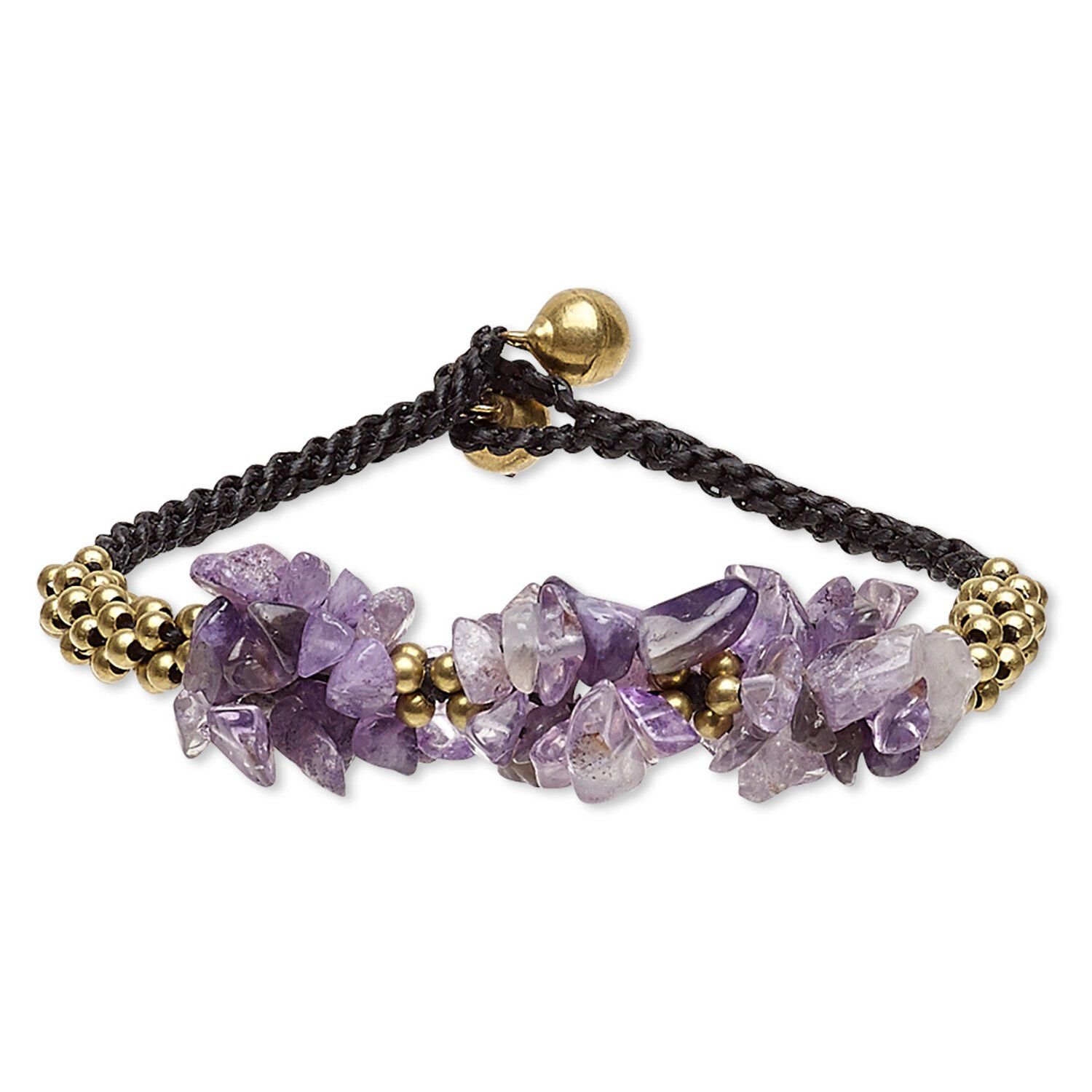 Enhance a lovely look with the musical tinkling of bells! This bracelet is ideal for adding a touch of enchanting whimsy to stacked bracelet styles and other looks; it features attractive amethyst chips on a nylon macramé cord and is accented with brass beads and steel bells. Sizes, shapes and colors may vary with handcrafted items.