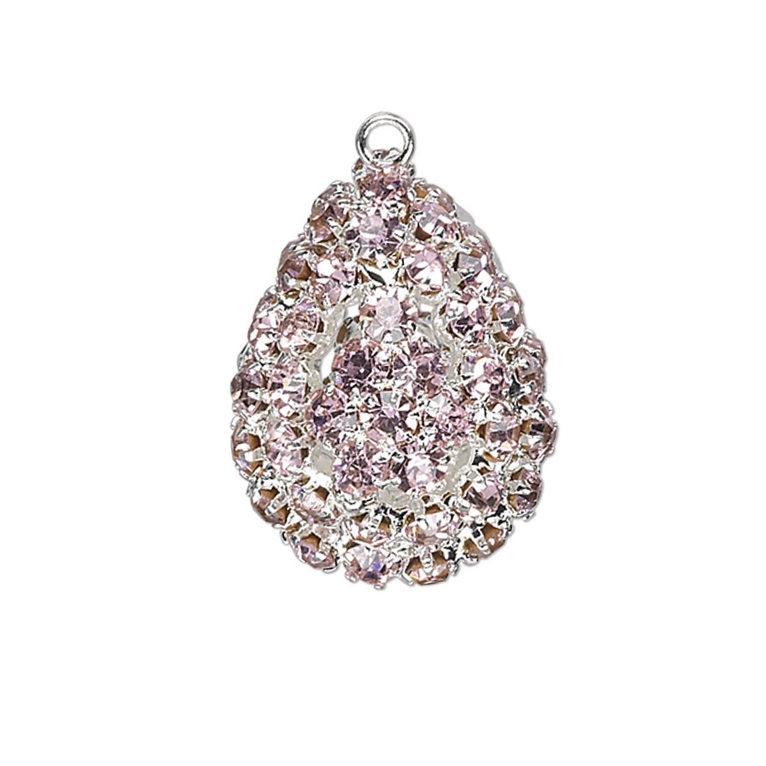 Double-sided teardrop focal is elegantly set with faceted chaton rhinestones, adding sparkle to jewelry designs. Pink rhinestones are held secure with prong settings and stand out against a neutral silver-plated brass base. Due to the manufacturing process, one side of each focal component can contain a subtle gap in the pattern. Size, shape and color may vary.