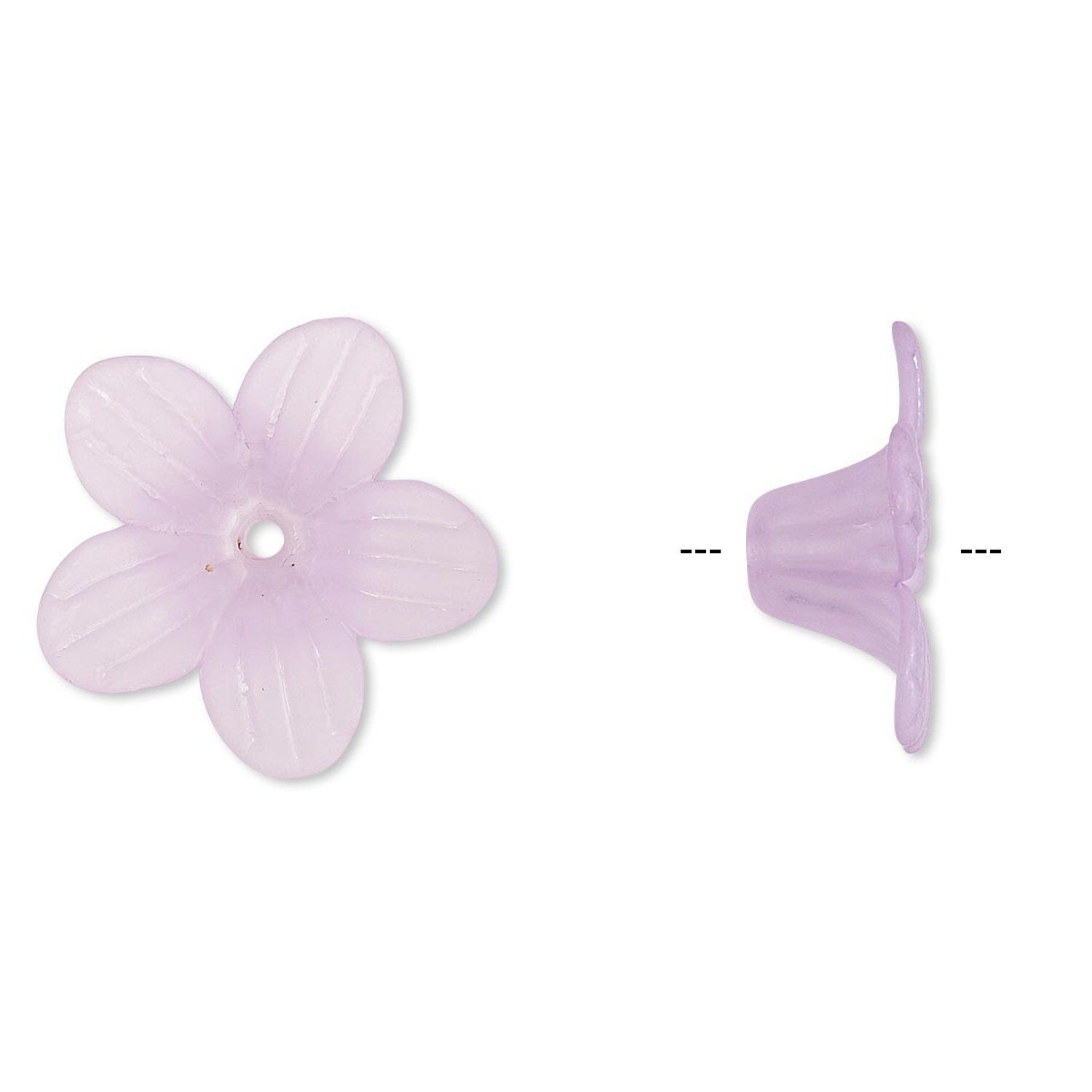 Lightweight acrylic flower with frosted, textured petals has a center stringing hole. Ideal for nature-themed jewelry designs. Colors, shapes and sizes may vary in each lot.