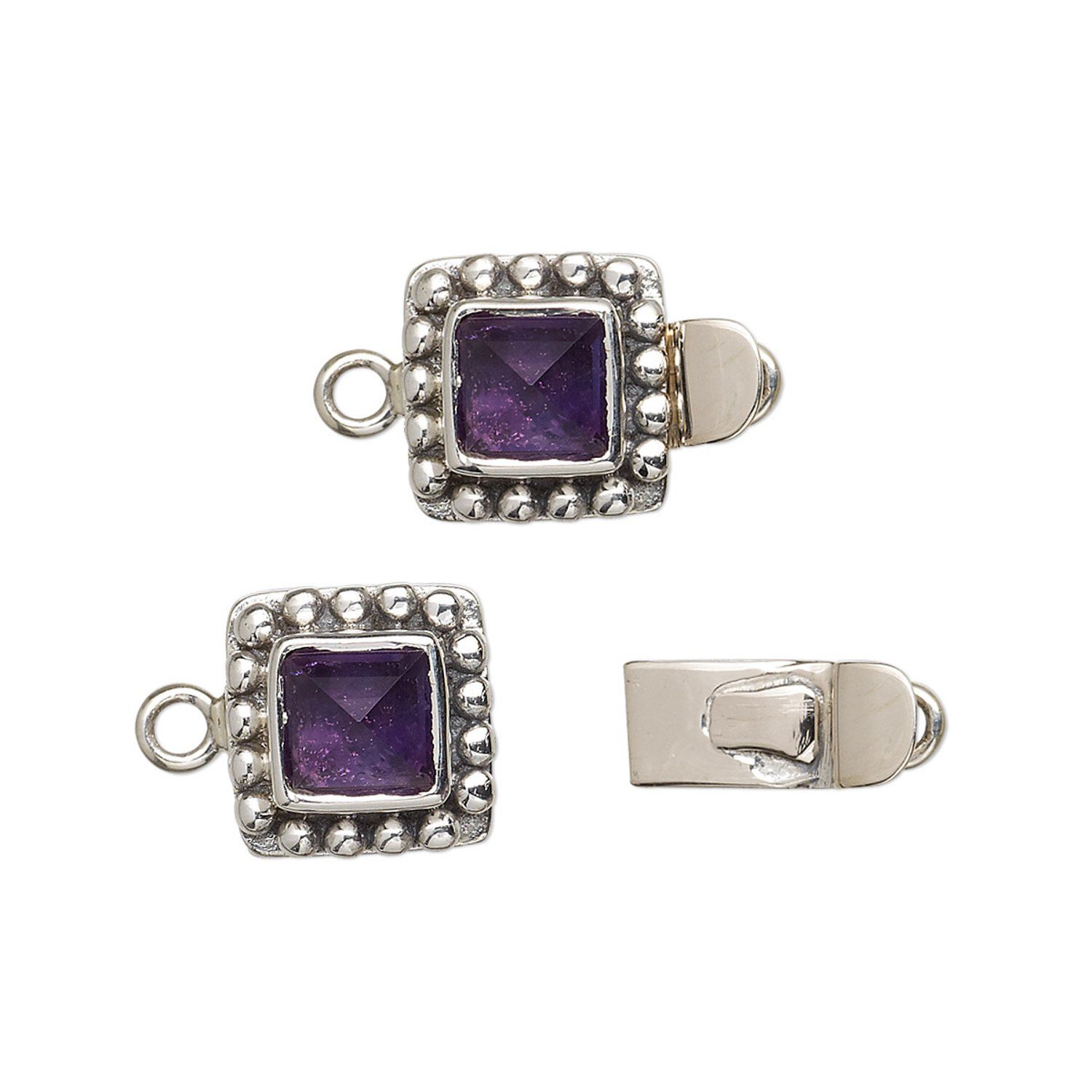 Make your designs distinctive with this sterling silver preset jeweled clasp. Each clasp is individually handmade, featuring a 6mm faceted square amethyst. Sizes, shapes and colors may vary with handcrafted items.