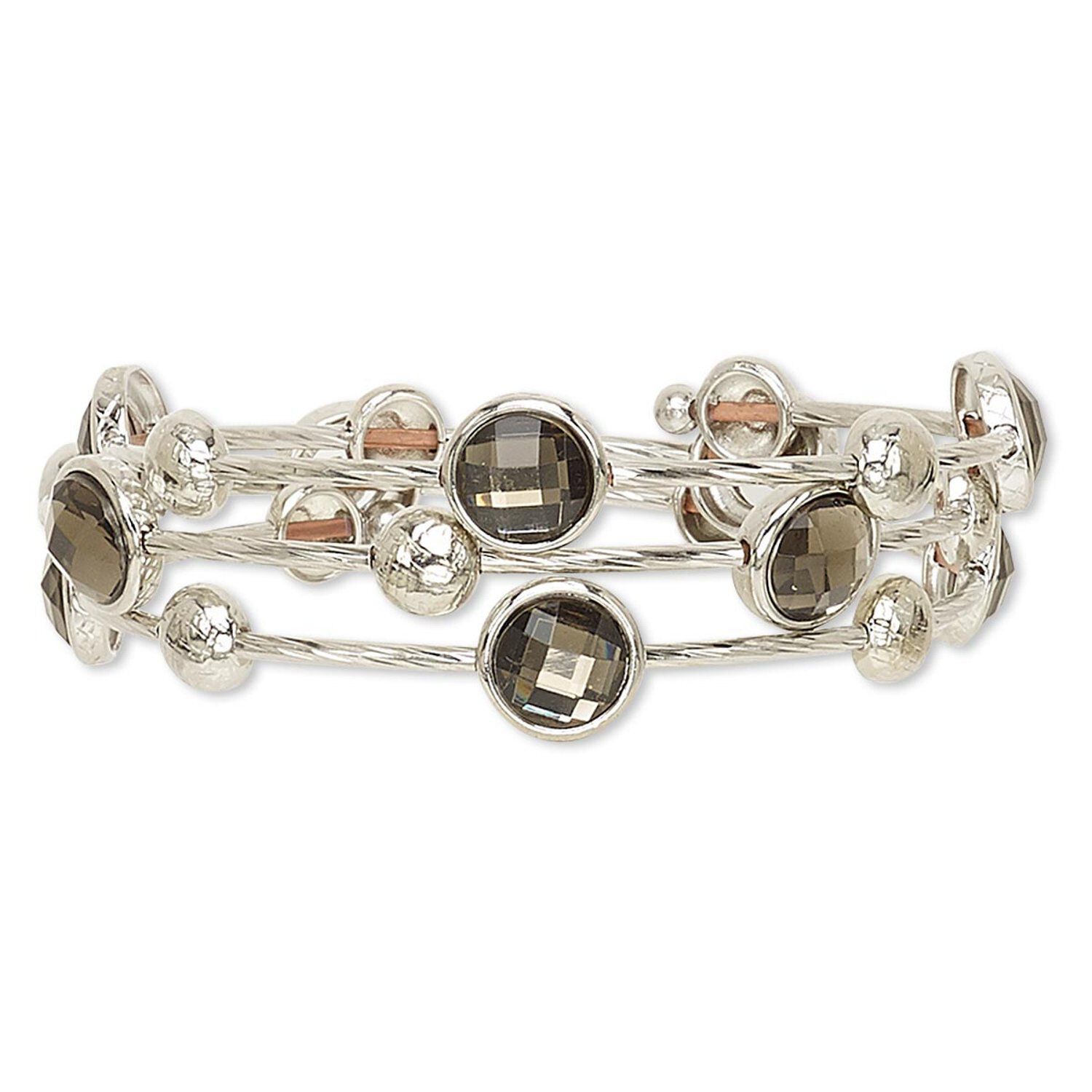 Adjustable spiral bracelet displays faceted smoky topaz acrylic cabochons paired with smooth round beads. The stylish, ready-to-wear design features a bright imitation-rhodium plating. Ideal for gift giving, counter sales or extending current jewelry lines.