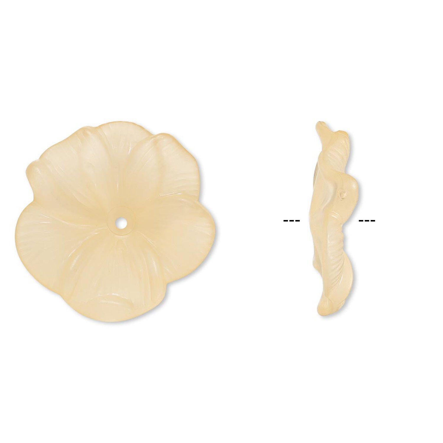 Lightweight acrylic flower with frosted, textured petals has a center stringing hole. Ideal for nature-themed jewelry designs. Colors, shapes and sizes may vary in each lot.