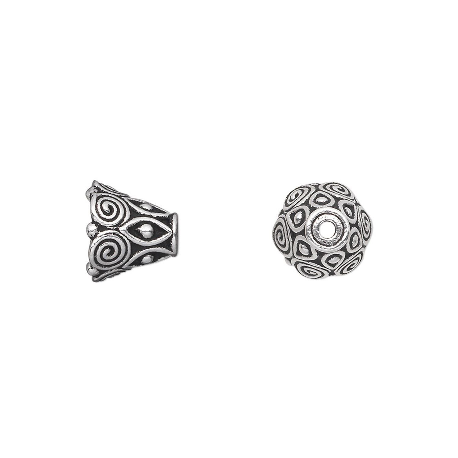 Cone, TierraCast®, antique silver-plated pewter (tin-based alloy), 9x8.5mm with bead and swirls design, 6mm inside diameter. Sold per pkg of 2.