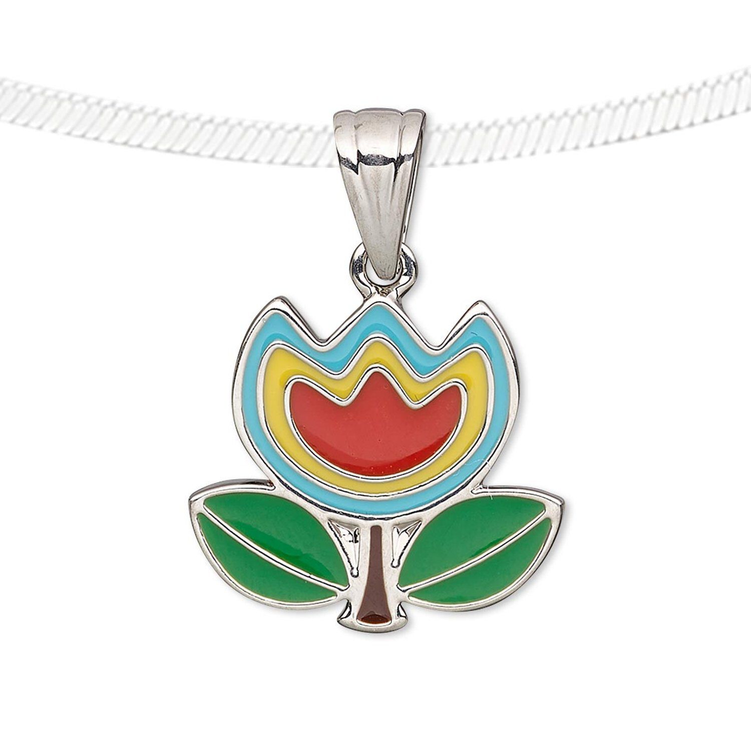 Tin-based pewter pendant with silver finish and brightly colored enamel highlights. Pendant features a one-sided, tulip design.
