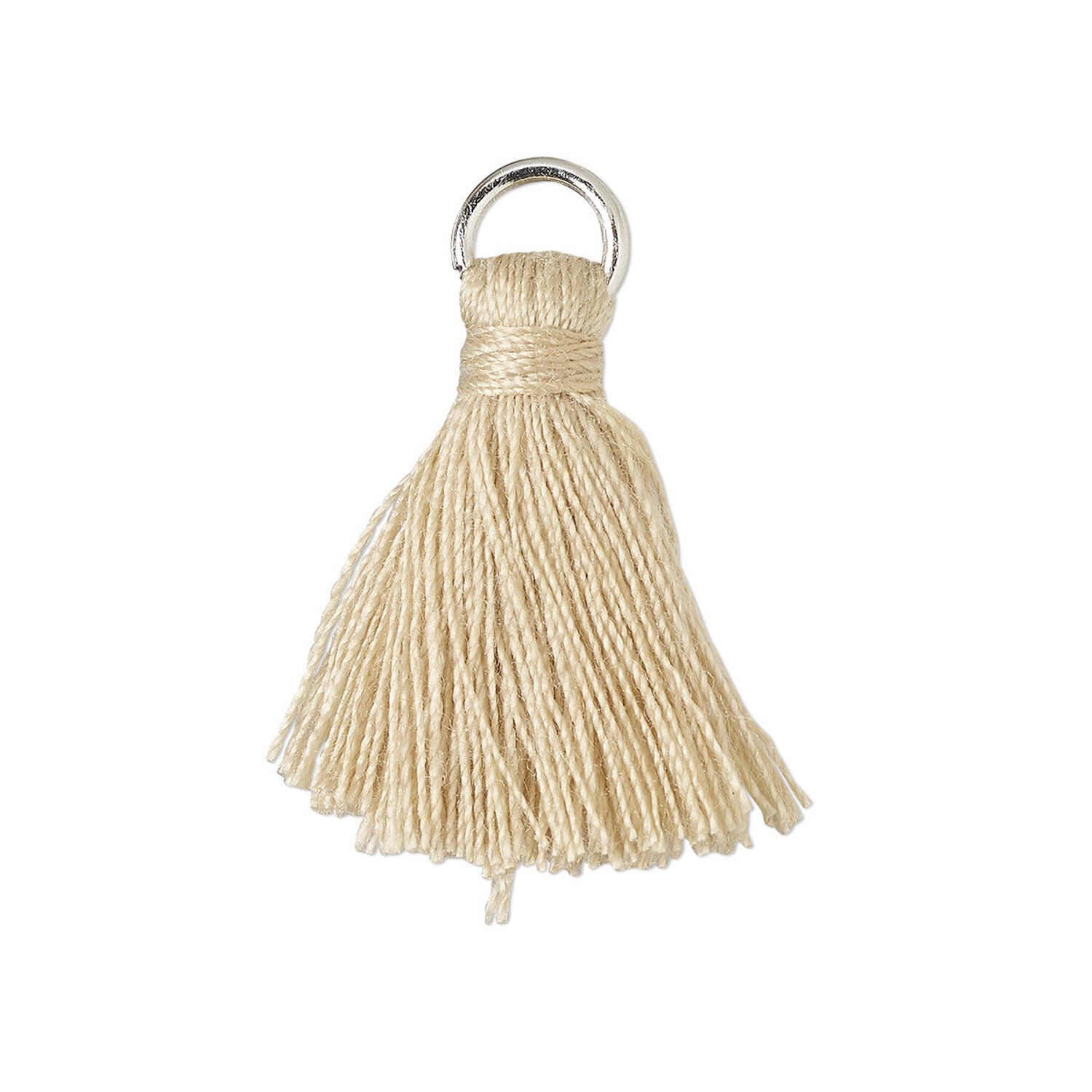 Tassel, cotton and imitation rhodium-finished steel, beige, 20-24mm mini tassel with 6mm open jump ring. Sold per pkg of 6.