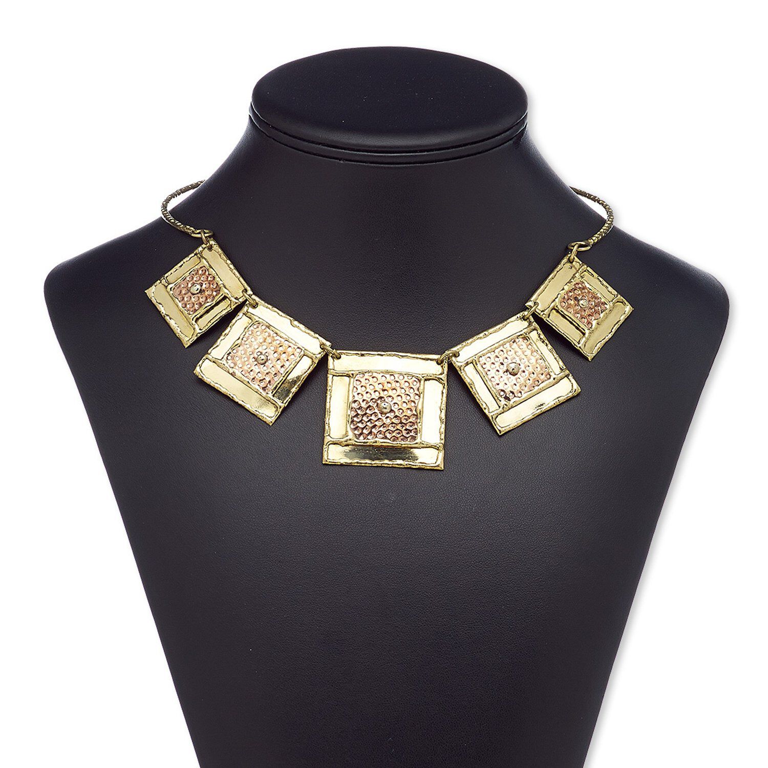 Ready-to-wear jewelry is perfect for gift-giving, counter sales or extending current jewelry lines. Brass-plated brass and steel necklace features handcrafted graduated square drops. Sizes, shapes and colors may vary with handcrafted items.