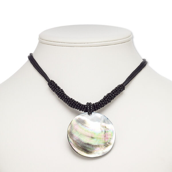 Necklace, resin / black lip shell (assembled) / waxed cotton cord / glass / imitation rhodium-plated brass / steel, black, 49mm round, 18 inches with 3-inch extender chain and lobster claw clasp. Sold individually.