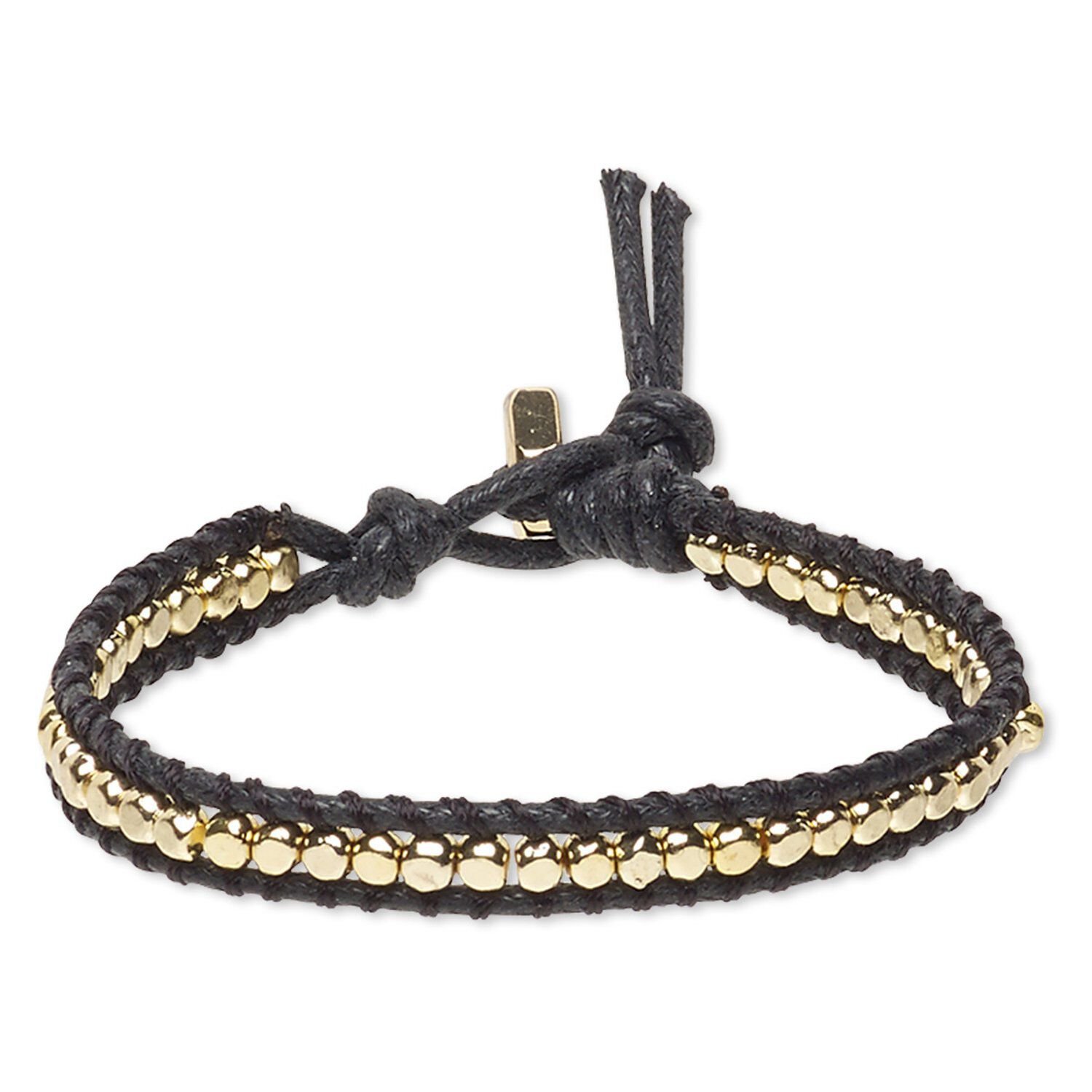 Bracelet, waxed cotton cord with gold-finished brass and steel, black, 8mm wide, 6-1/2 inches with a hex nut clasp. Sold individually.