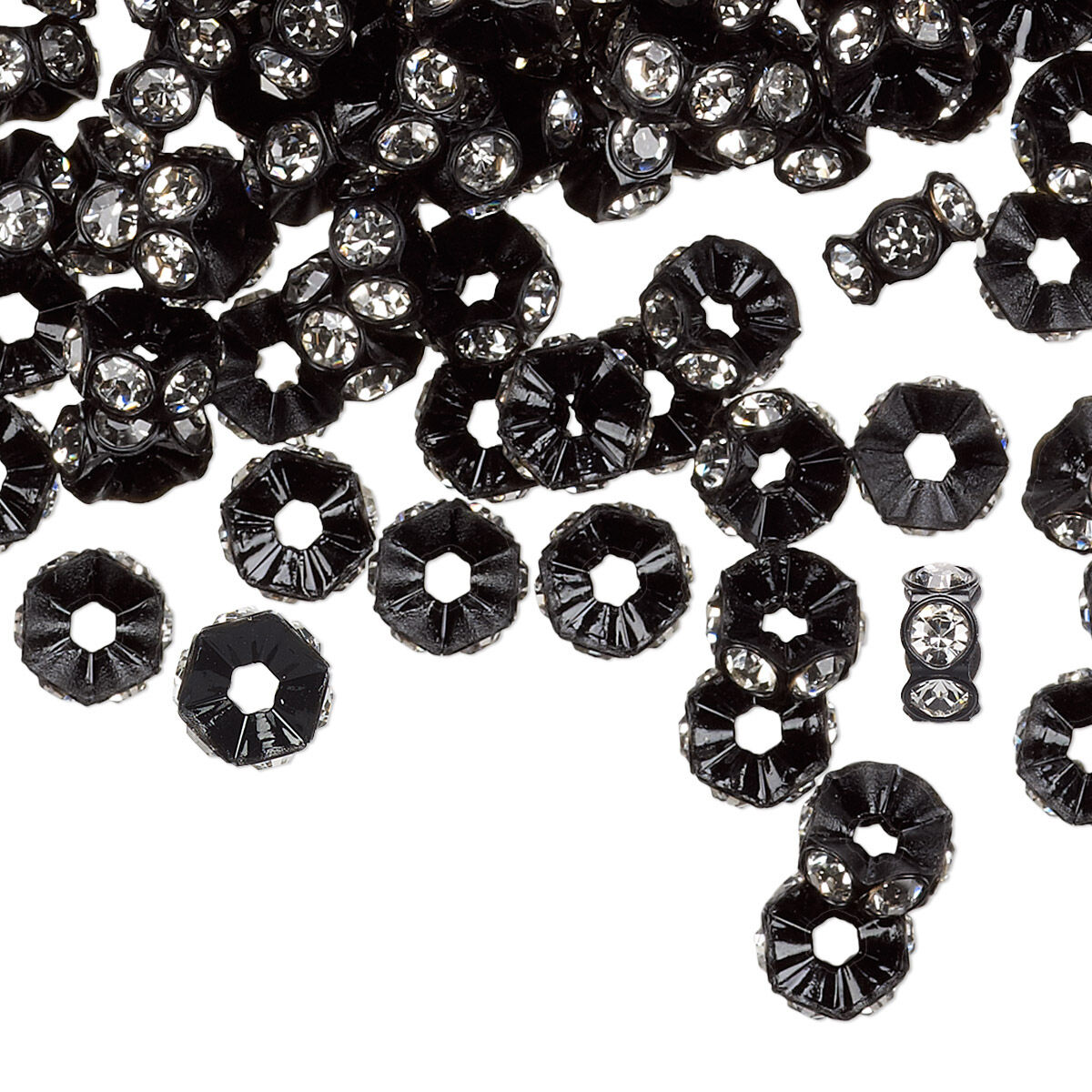 Sparkling crystal foil back chatons are set in plastic, surrounding the center hole of this mini rondelle bead. Lightweight beads enhance designs without adding a metal color or shine. Safe for most wearers with allergies or sensitivities.