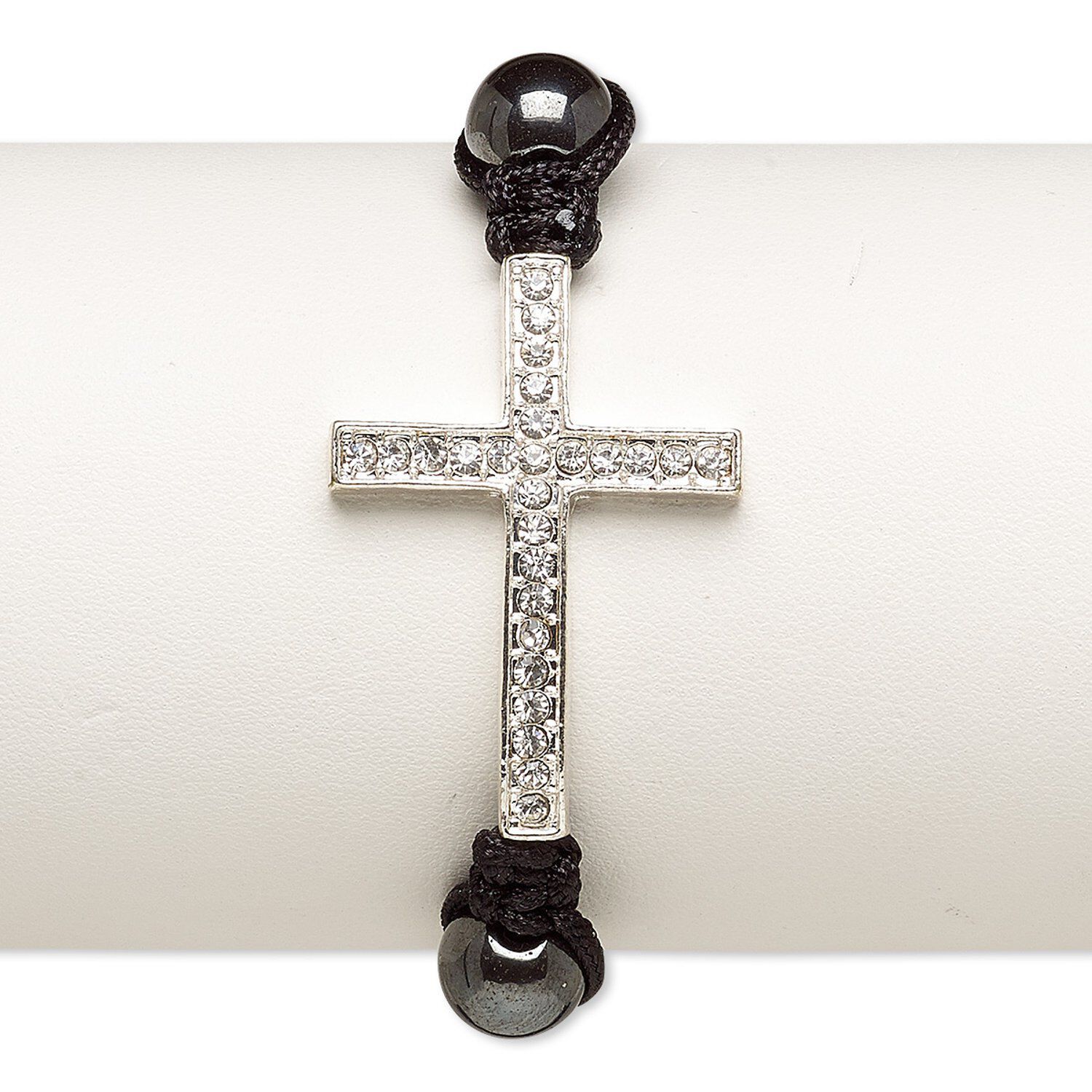 Bracelet, Hemalyke™ (manmade) / glass rhinestone / waxed cotton cord / silver-plated "pewter" (zinc-based alloy), black and clear, 36.5x26mm curved cross, adjustable from 7-10 inches with macramé knot closure. Sold individually.