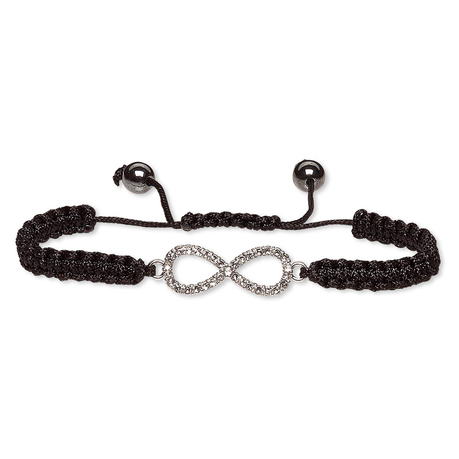 Bracelet, Hemalyke™ (manmade) / waxed cotton cord / glass rhinestone / silver-plated "pewter" (zinc-based alloy), black and clear, 31x12mm infinity, adjustable from 7-10 inches with macramé knot closure. Sold individually.