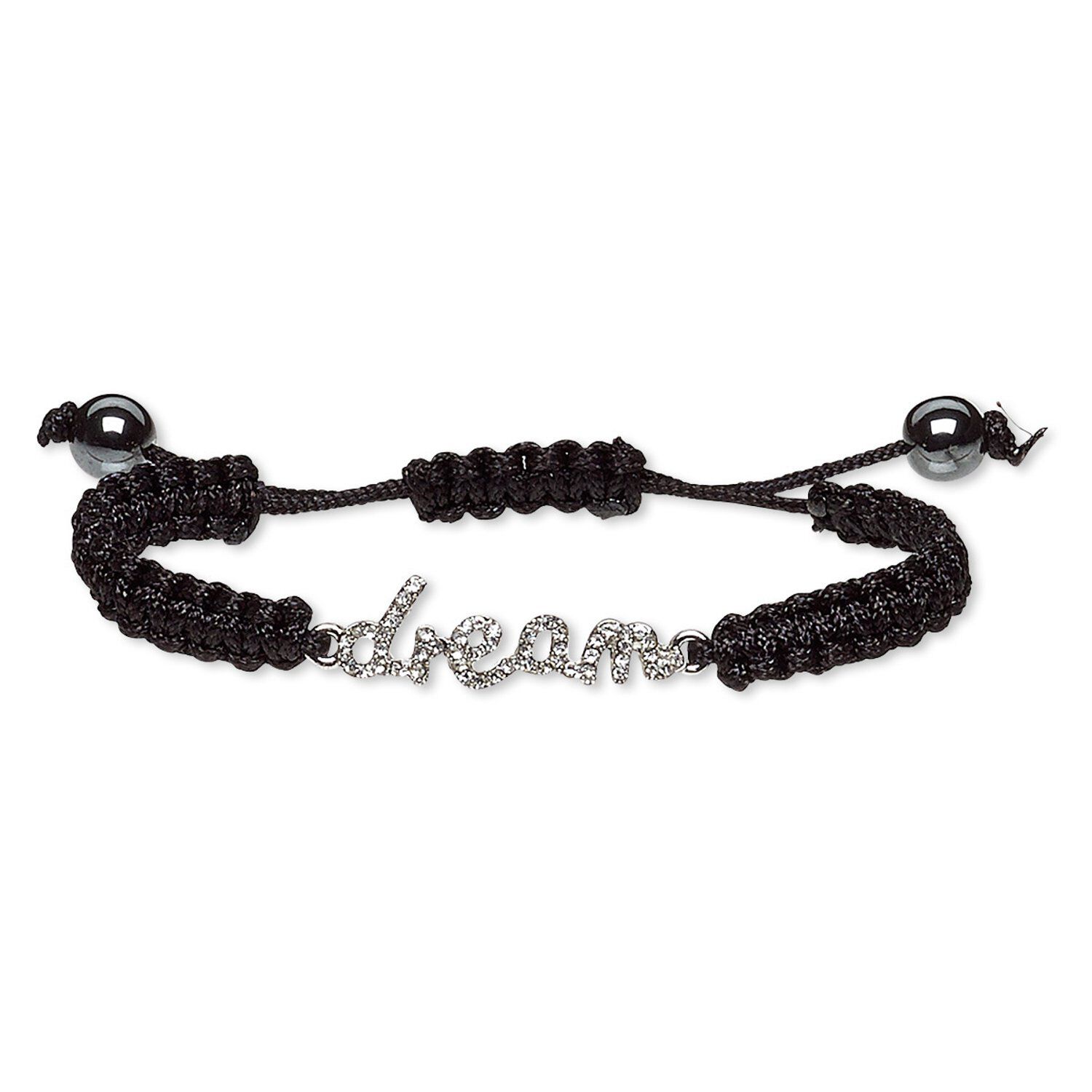 Bracelet, Hemalyke™ (man-made) / waxed cotton cord / glass rhinestone / silver-plated "pewter" (zinc-based alloy), black and clear, 31x10mm "dream," adjustable from 6-1/2 to 9 inches with macramé knot closure. Sold individually.