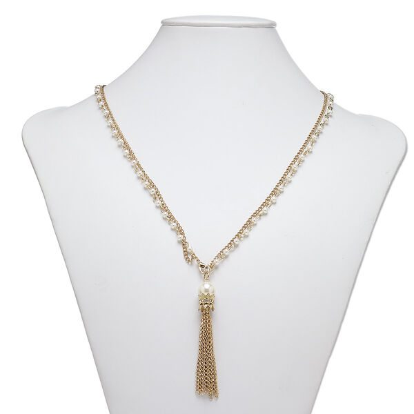 Necklace, 2-strand, acrylic pearl / glass rhinestone / gold-finished steel, white and clear, 3-inch dangle, 36 inches with lobster claw clasp. Sold individually.