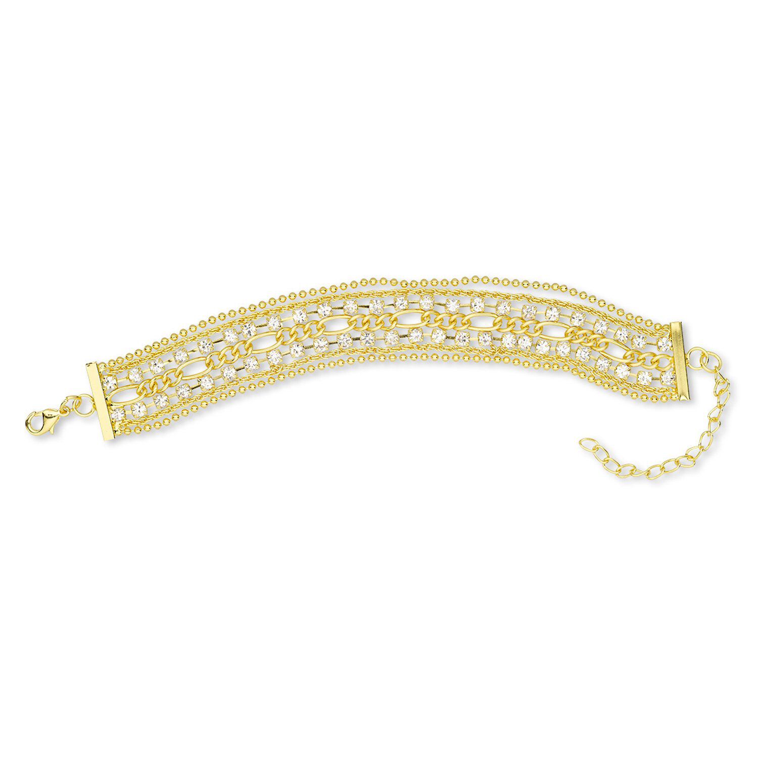 Bracelet, 7-strand, glass rhinestone / gold-finished brass / steel / "pewter" (zinc-based alloy), clear, 20mm wide, 6-1/2 inches with 2-1/2 inch extender chain and lobster claw clasp. Sold individually.