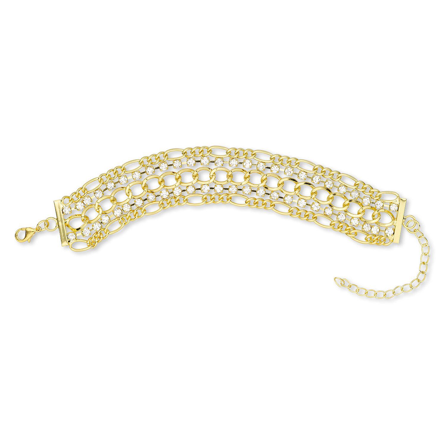 Bracelet, 5-strand, glass rhinestone / gold-finished brass / steel / "pewter" (zinc-based alloy), clear, 25mm wide, 6-1/2 inches with 2-1/2 inch extender chain and lobster claw clasp. Sold individually.