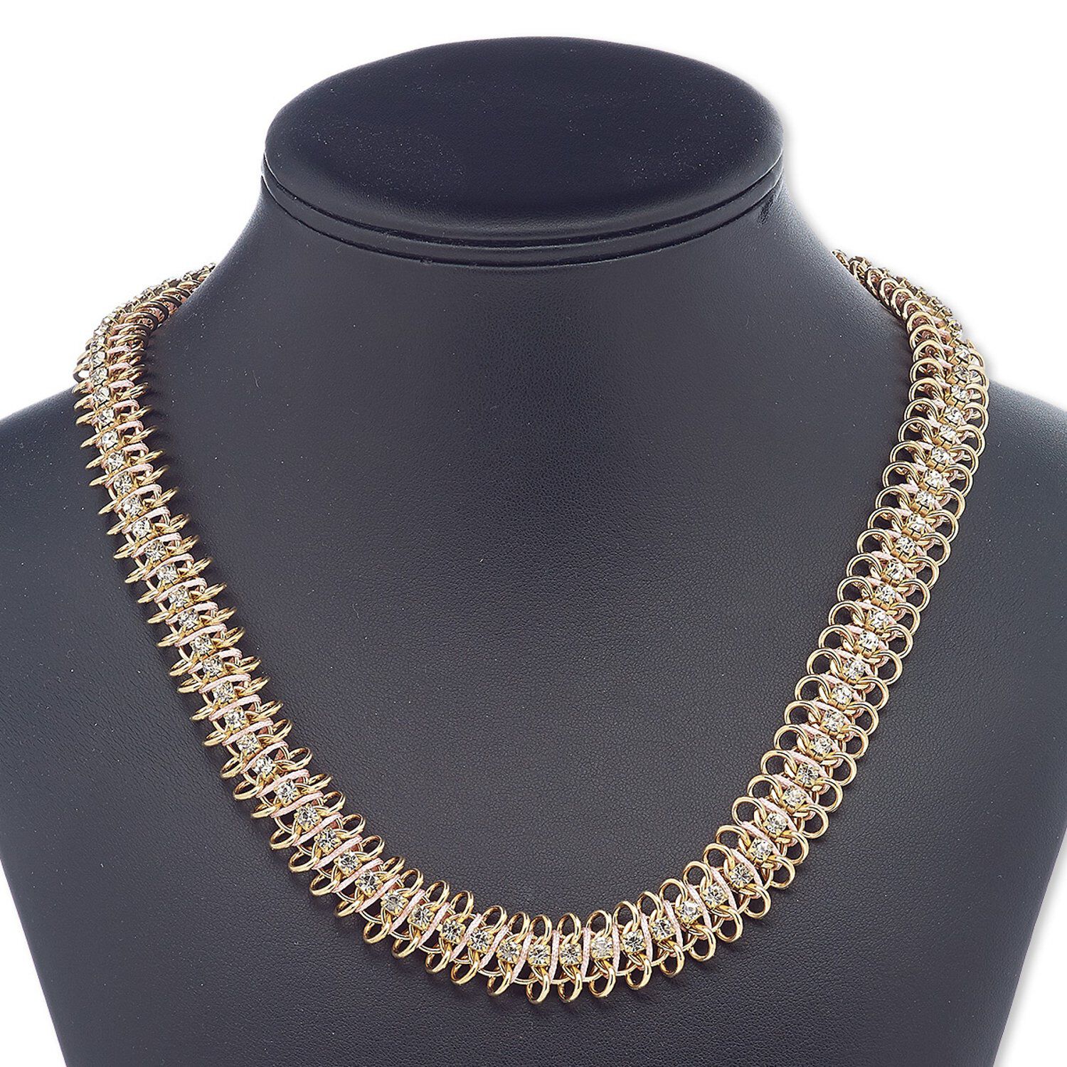 Add some metallic excitement to your style with this delightful chainmaille necklace. Light pink nylon is woven through gold-finished brass chain, which is embellished with clear glass rhinestone cupchain.