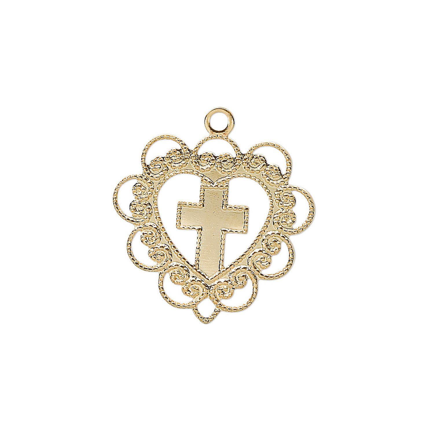 Drop, gold-plated brass, 20x19mm heart with cross. Sold per pkg of 4.