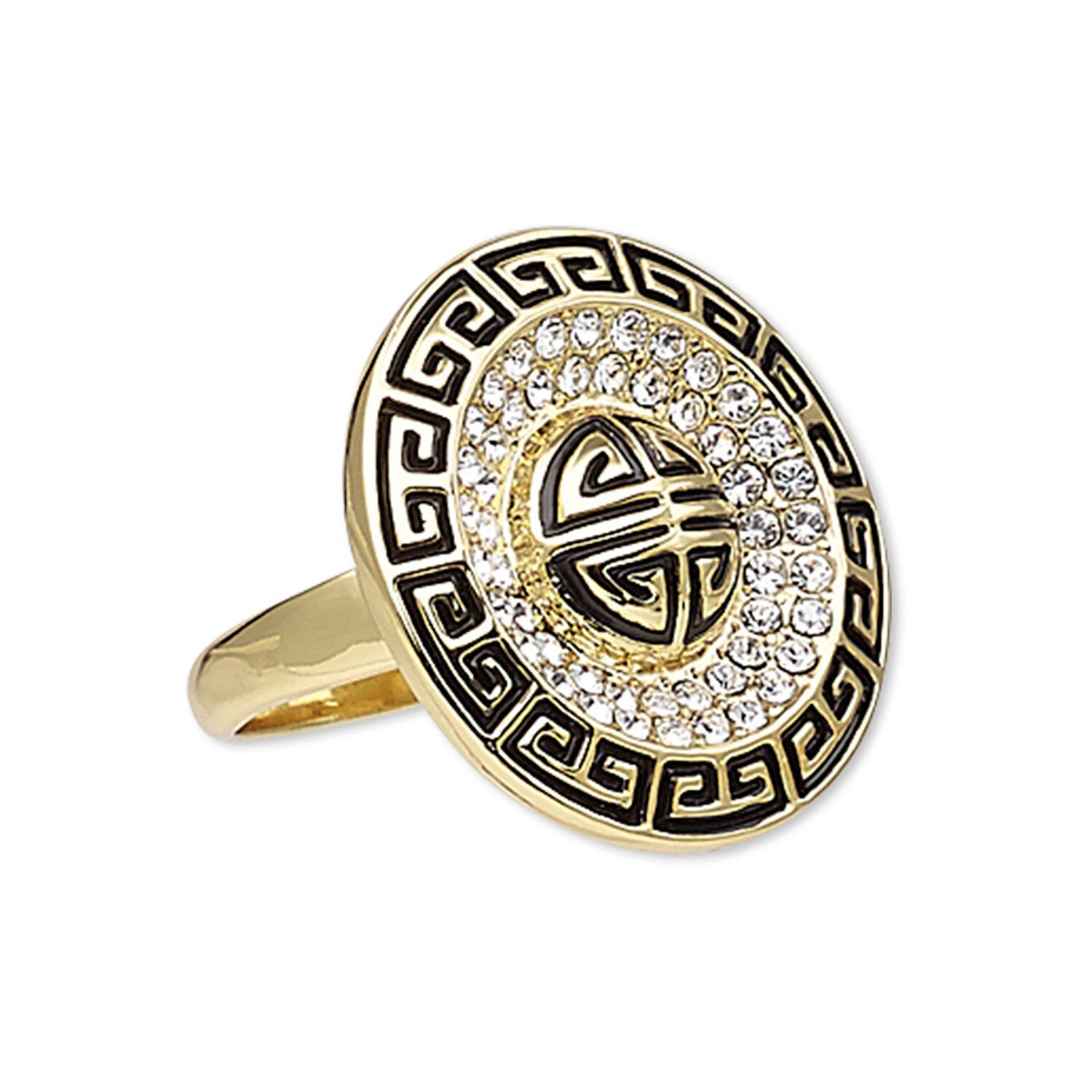 Ring, Austrian crystal / enamel / gold-finished "pewter" (zinc-based alloy), black and clear, 26mm round with Greek key design, size 9. Sold individually.