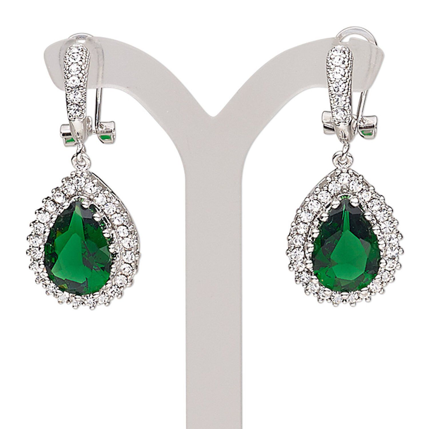 Teardrop-shaped, silver-plated brass earring set has the classic look of elegance with a faceted emerald green glass stone, surrounded by Austrian crystal rhinestones. This finished set is ready to wear or sell straight out of the package.