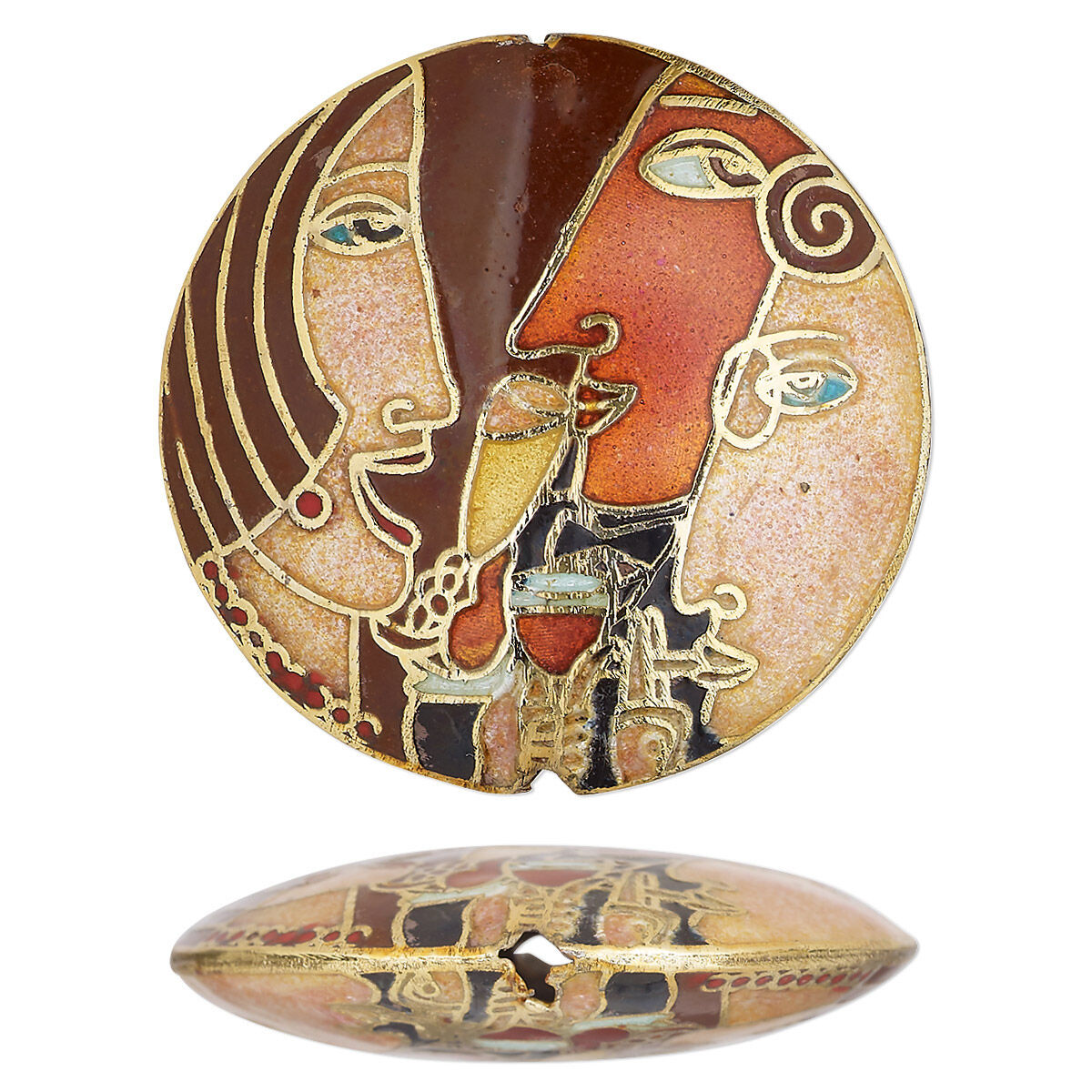 Bead, cloisonné, multicolored, 35x10mm double-sided puffed round with side profile face design. Sold individually.