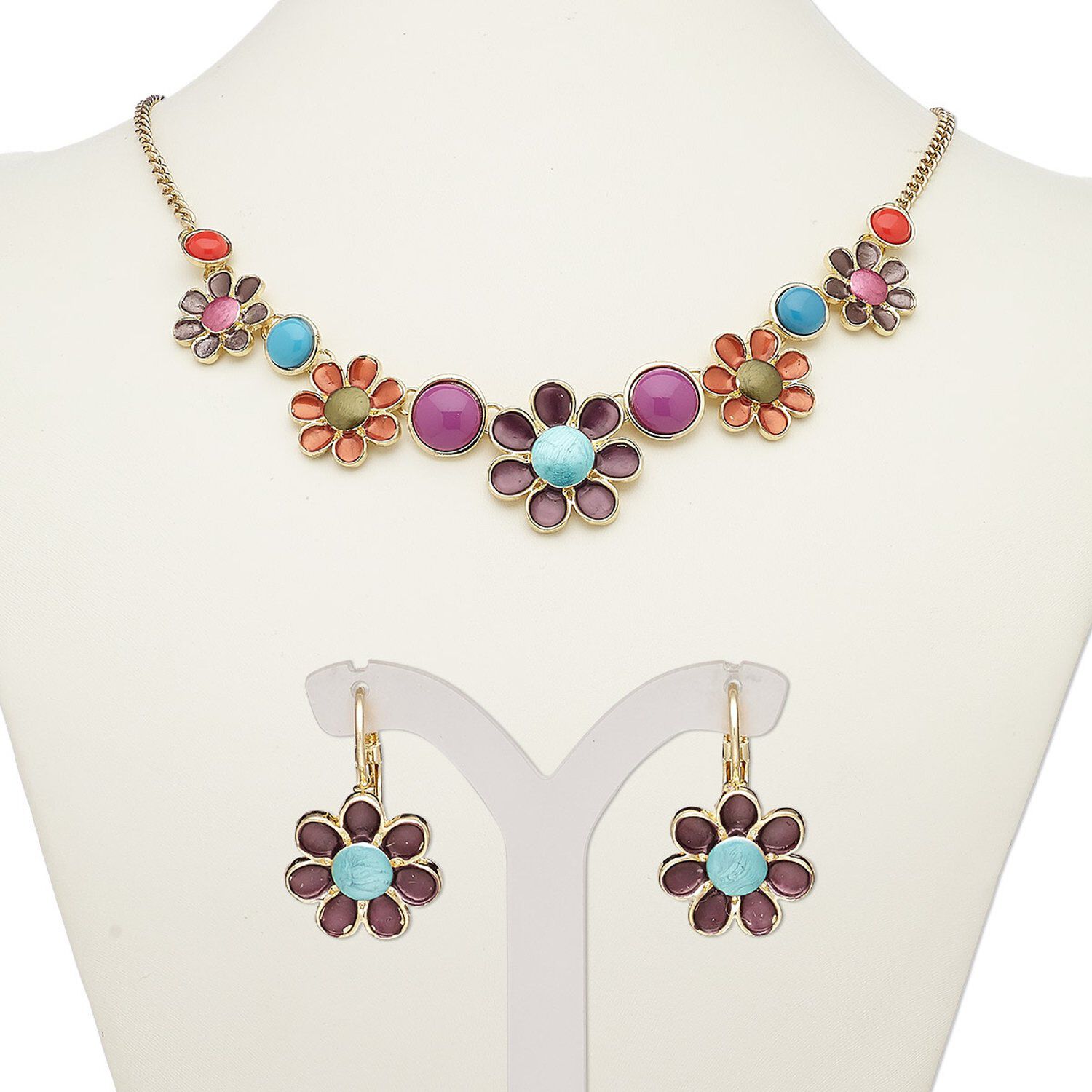 Ready-to-wear necklace and earring set features multicolored flowers and gold-finished steel. Colors, shapes and sizes may vary in each lot.