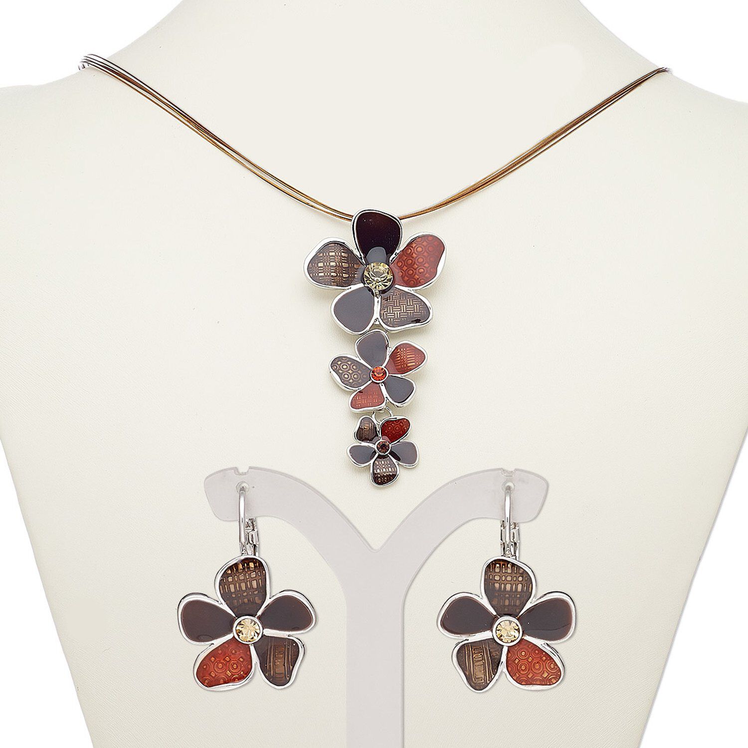 Necklace and earring set, 5-strand, enamel / glass rhinestone / silver-plated steel / "pewter" (zinc-based alloy), multi-brown, 3-inch dangle with flowers, 18-inch necklace with 2-inch extender chain and lobster claw clasp, 29mm earrings with leverback ear wire. Sold per set.